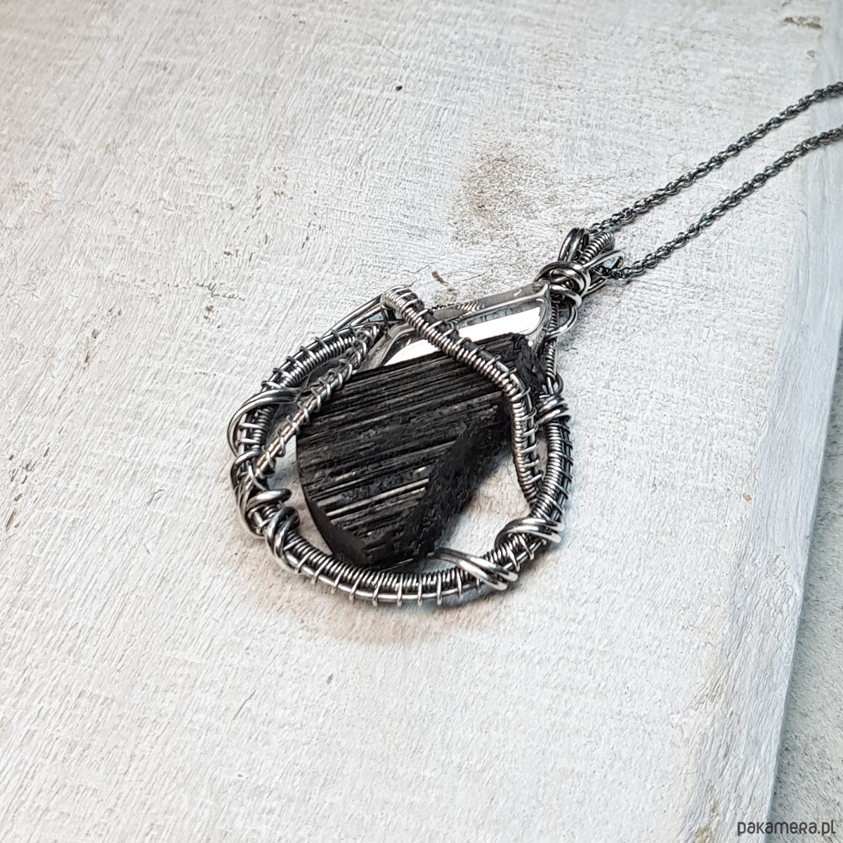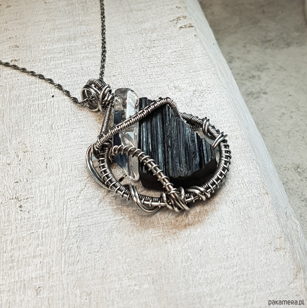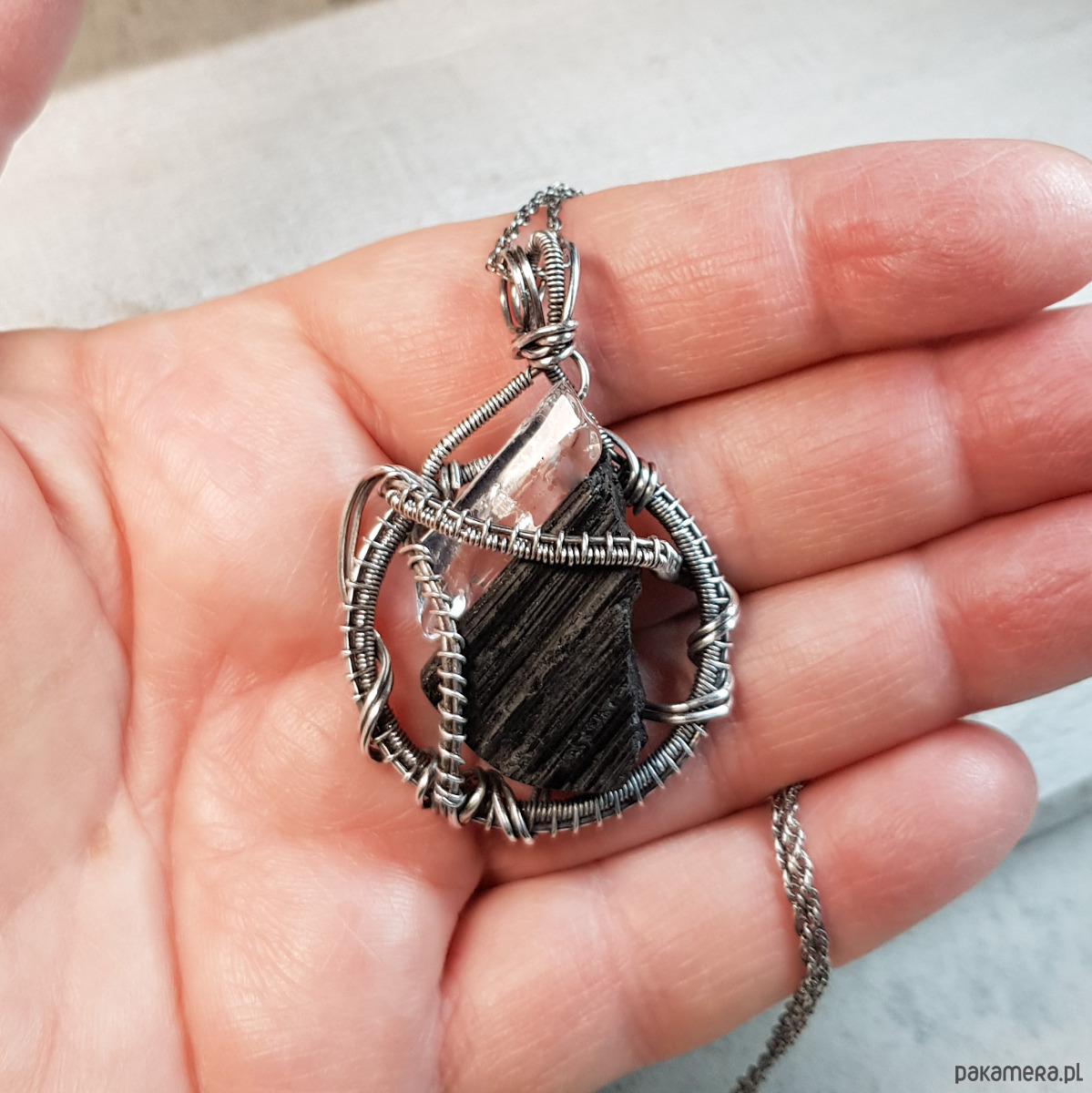 Zawieszka wykonana ręcznie metodą wire-wrappingu z czarnego turmalinu i sopla kryształu górskiego . Do wykonania wisiorka użyłam srebrnego drutu najwyższej próby 999, wymiary zawieszki 50x34mm, z łańcuszkiem długości około 49-50 cm.