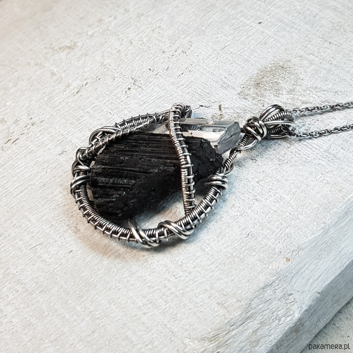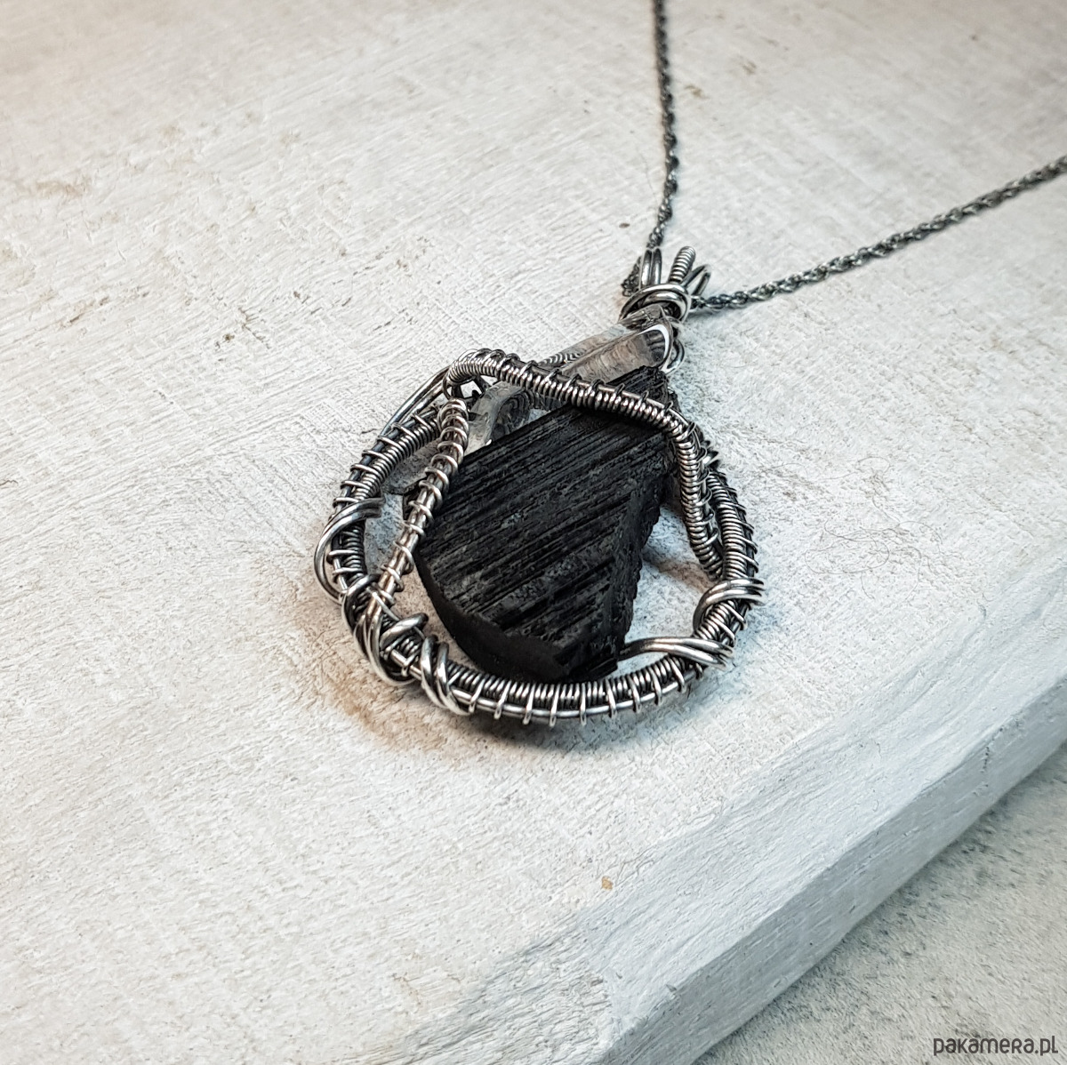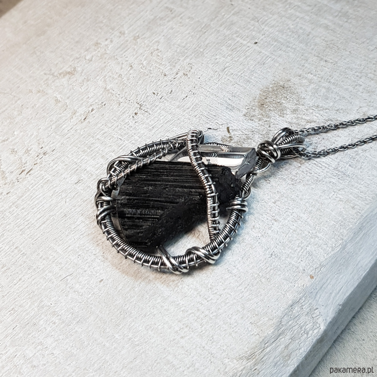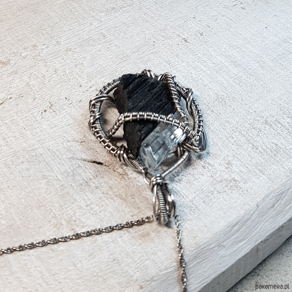 Zawieszka wykonana ręcznie metodą wire-wrappingu z czarnego turmalinu i sopla kryształu górskiego . Do wykonania wisiorka użyłam srebrnego drutu najwyższej próby 999, wymiary zawieszki 50x34mm, z łańcuszkiem długości około 49-50 cm.