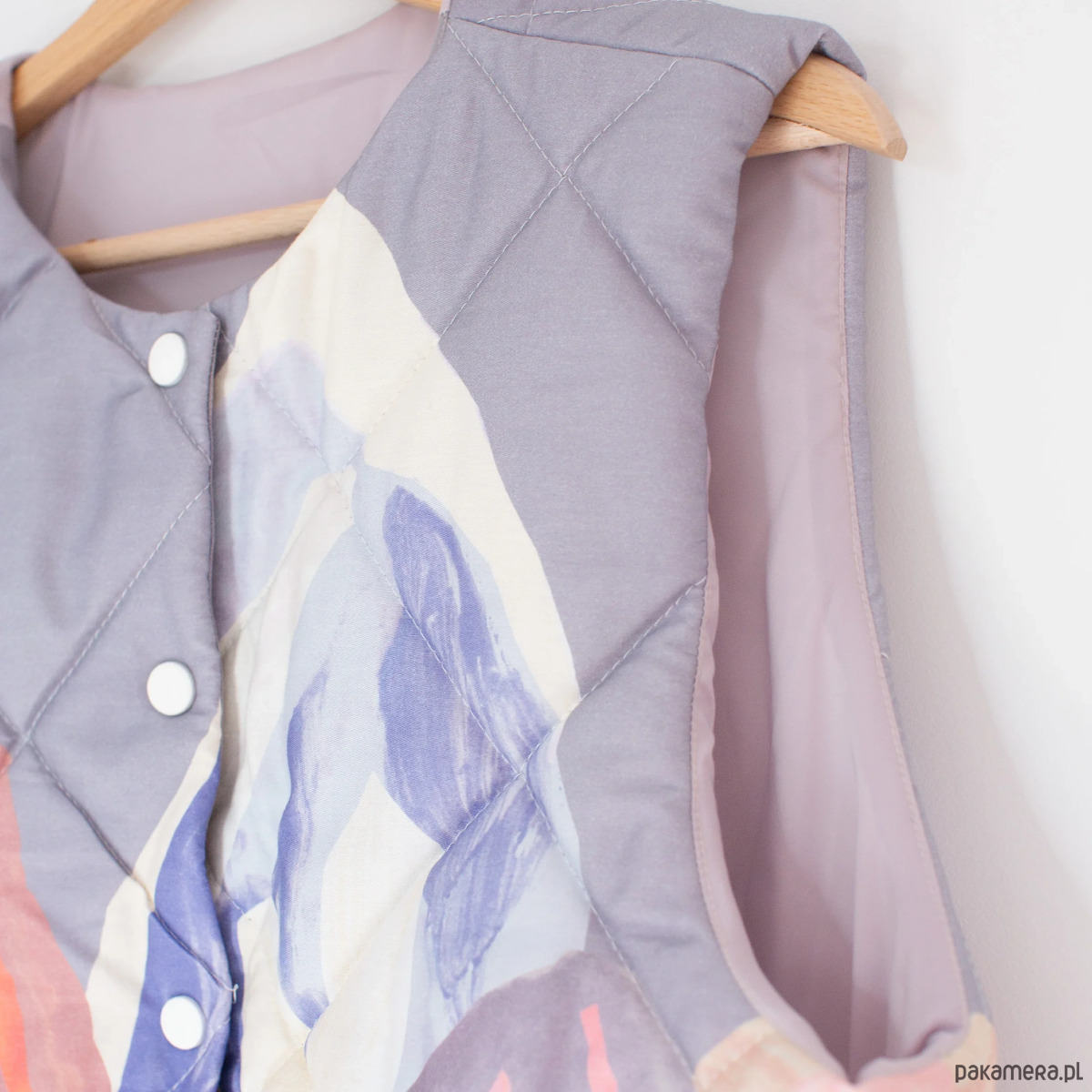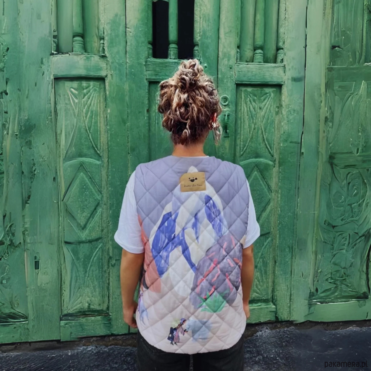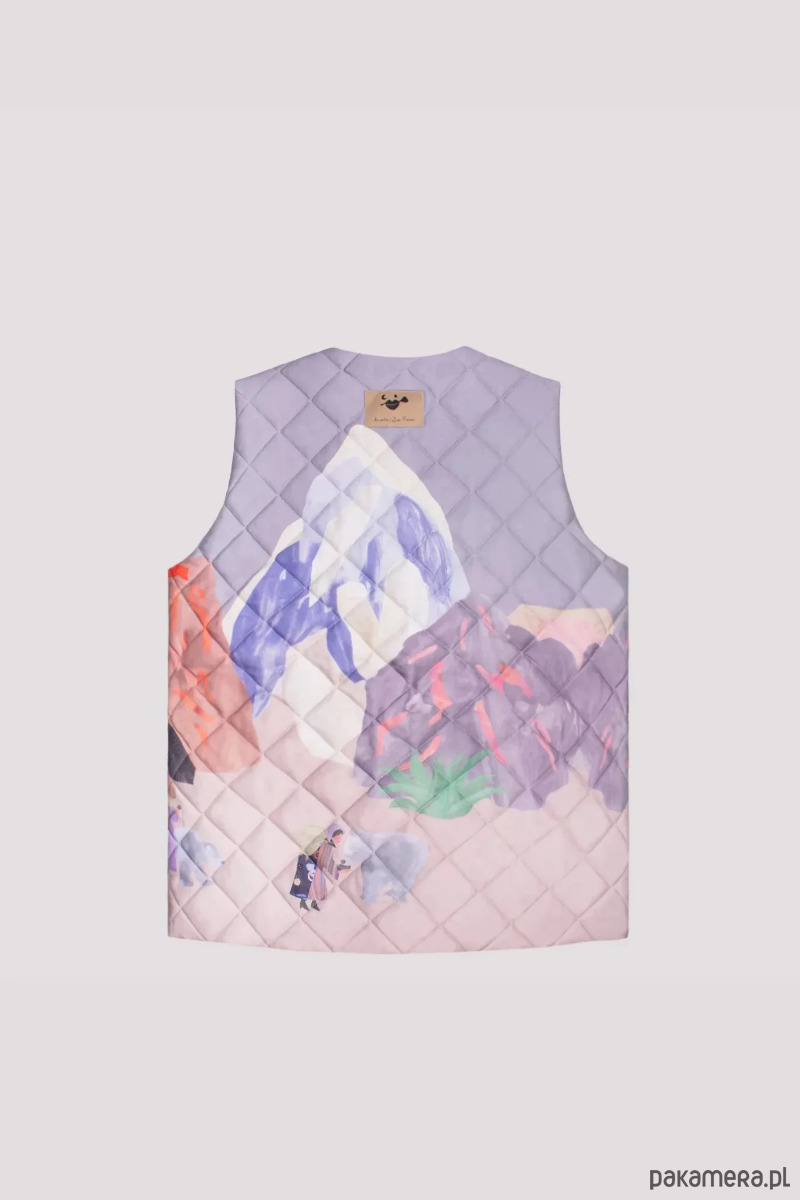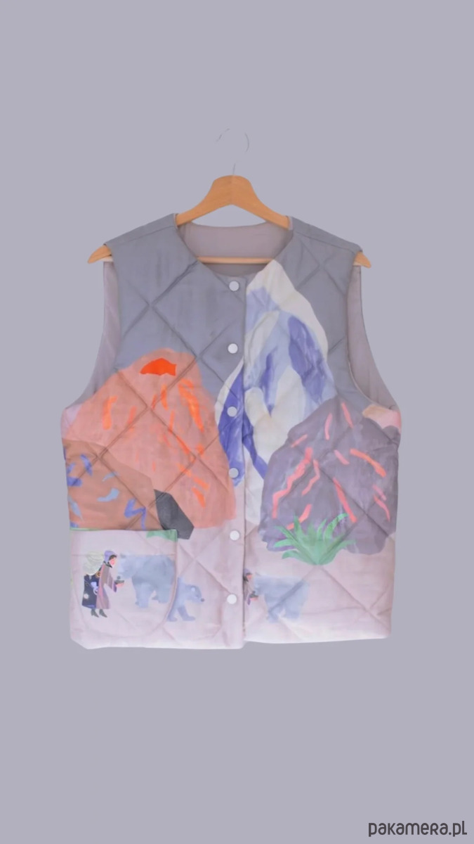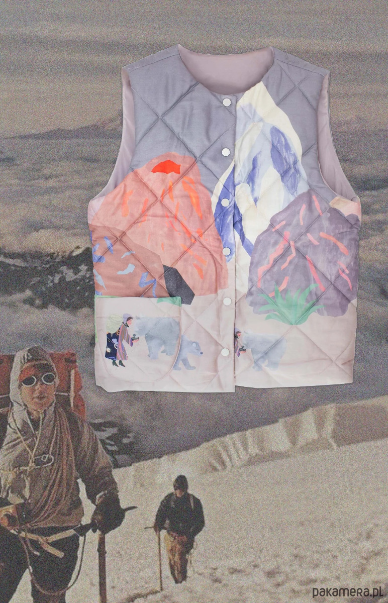 Wyjątkowy charakter kamizelki podkreśla grafika Aleksandry Majzel. Dostojny, zimowy krajobraz w chłodnych, pastelowych barwach przywodzi na myśl mroźne, srebrzyste widoki norweskiej wyspy Spitsbergen.