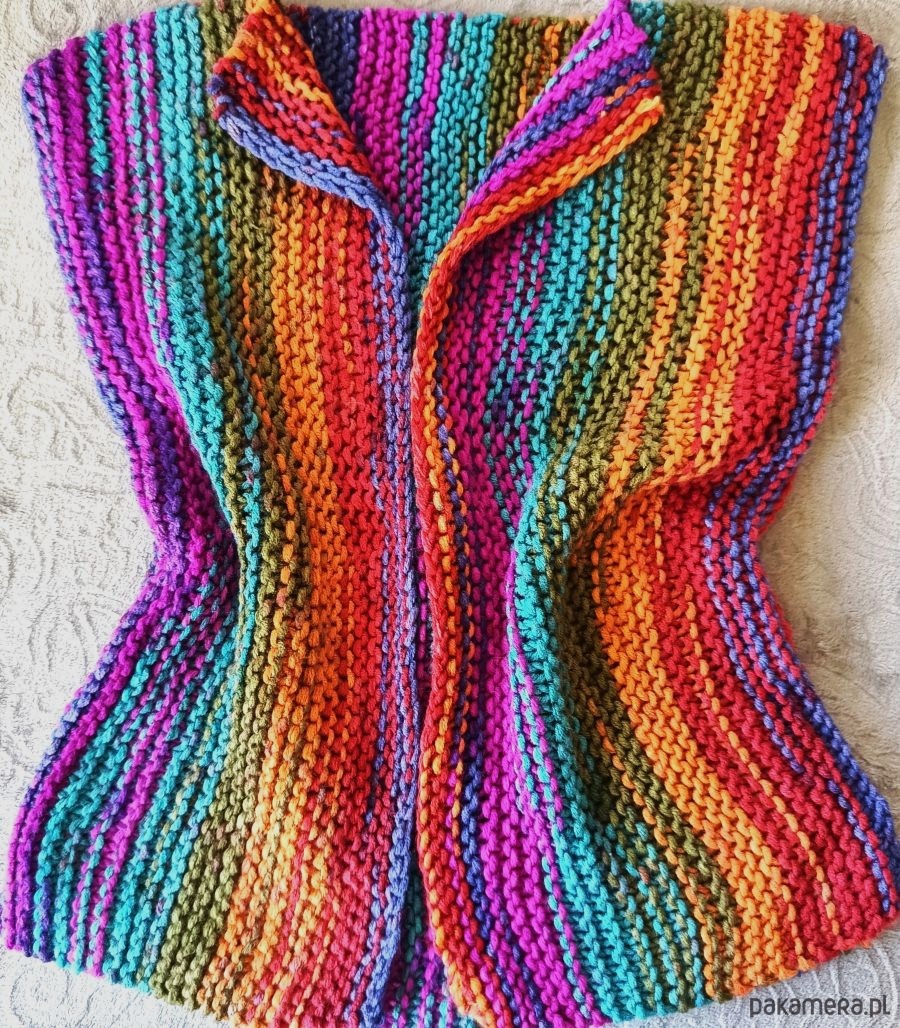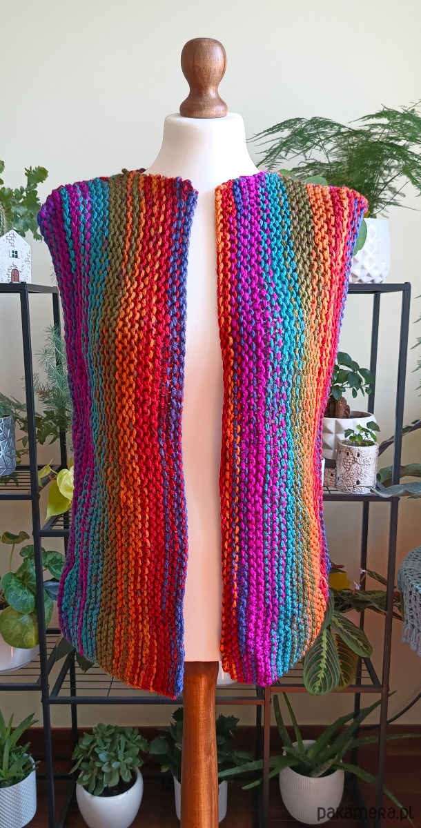 Kamizelka Boho wydziergana przeze mnie na drutach. Włóczka miękka, miła w dotyku. Bardzo kolorowa co dodaje atrakcyjności kamizelce.