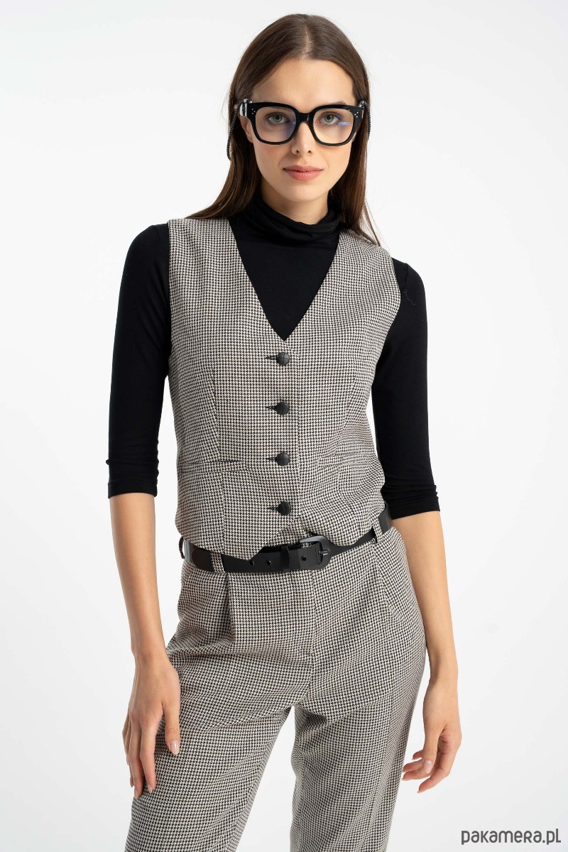 Klasyczna, dopasowana kamizelka zapinana na cztery ozdobne, skórzane guziki.