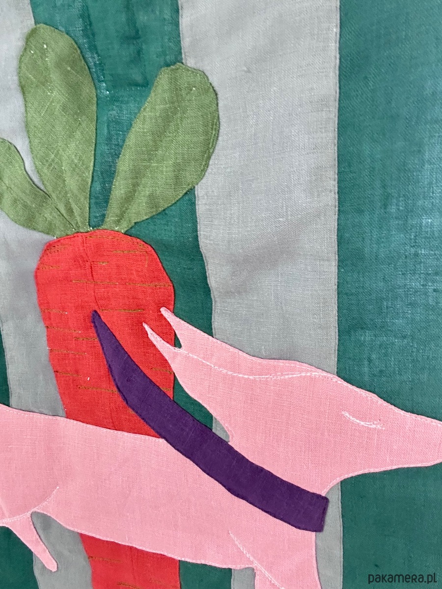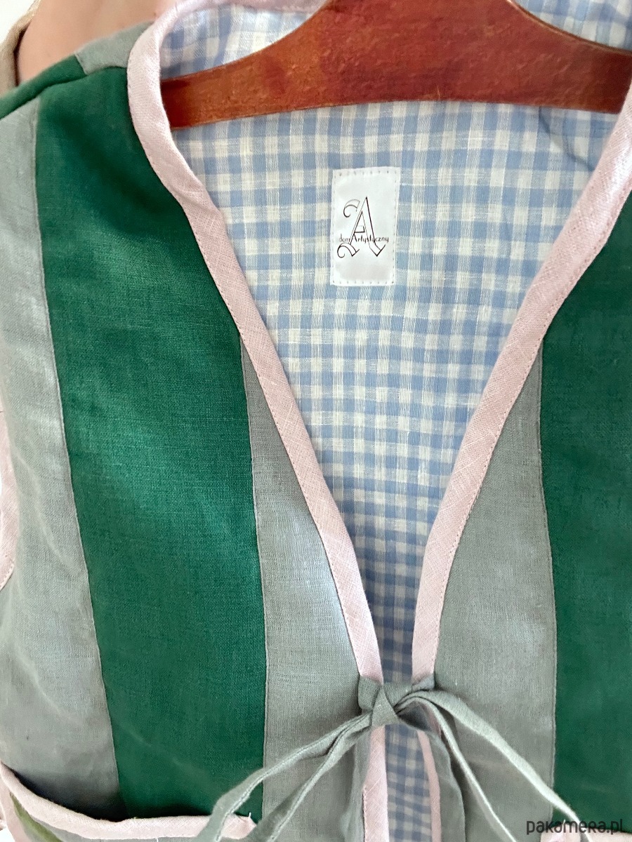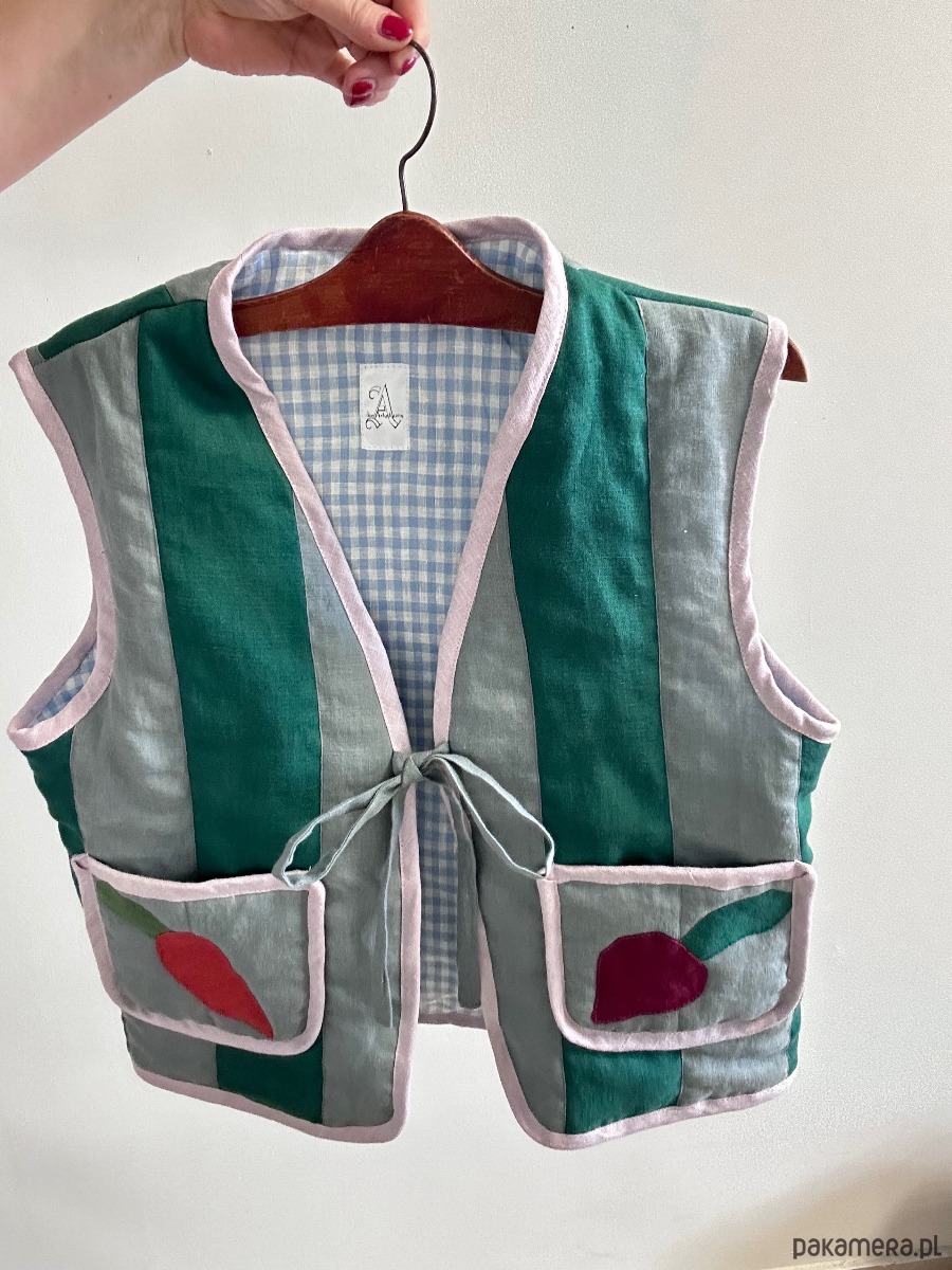 Patchworkowa kamizelka damska lniana z ręcznie wykonanymi aplikacjami jamnika i marchewki. Wykonana ze 100% lnu produkcji polskiej, w kolorach zieleni butelkowej i eukaliptusowej, pikowana wzdłuż szwów, z podszewką z lnu w biało niebieską kratkę.. Wiązana na troki.