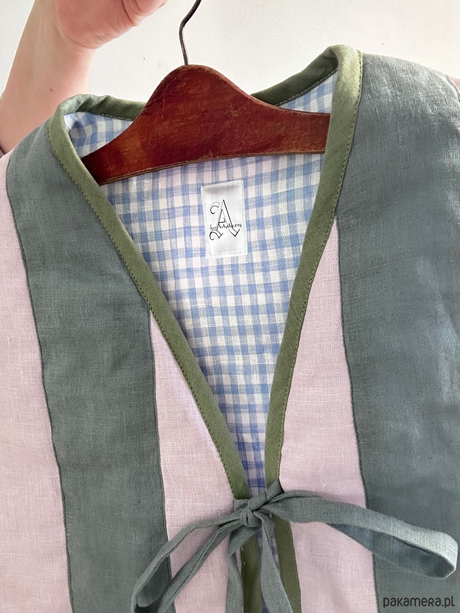 Patchworkowa kamizelka damska lniana z ręcznie wykonanymi aplikacjami jamnika i muchomora. Wykonana ze 100% lnu produkcji polskiej, w kolorach pudrowego różu i eukaliptusowej zieleni, pikowana wzdłuż szwów, z podszewką z lnu w biało niebieską kratkę.. Wiązana na troki.