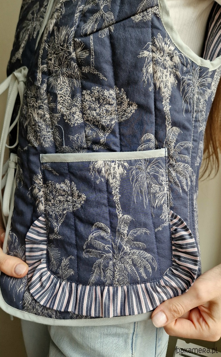 Kamizelka pikowana z wiązaniem i kieszeniami w naturalny wzór.