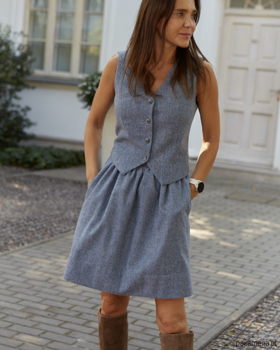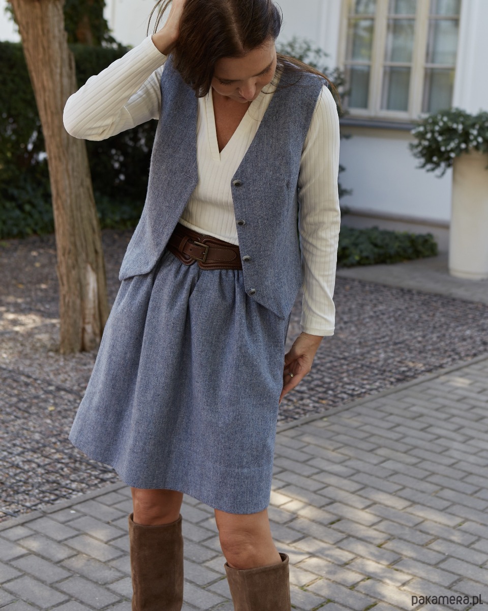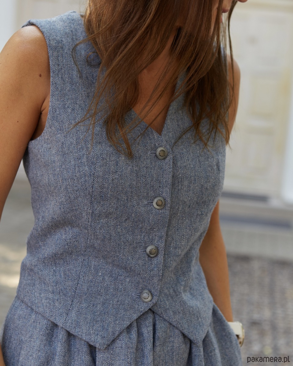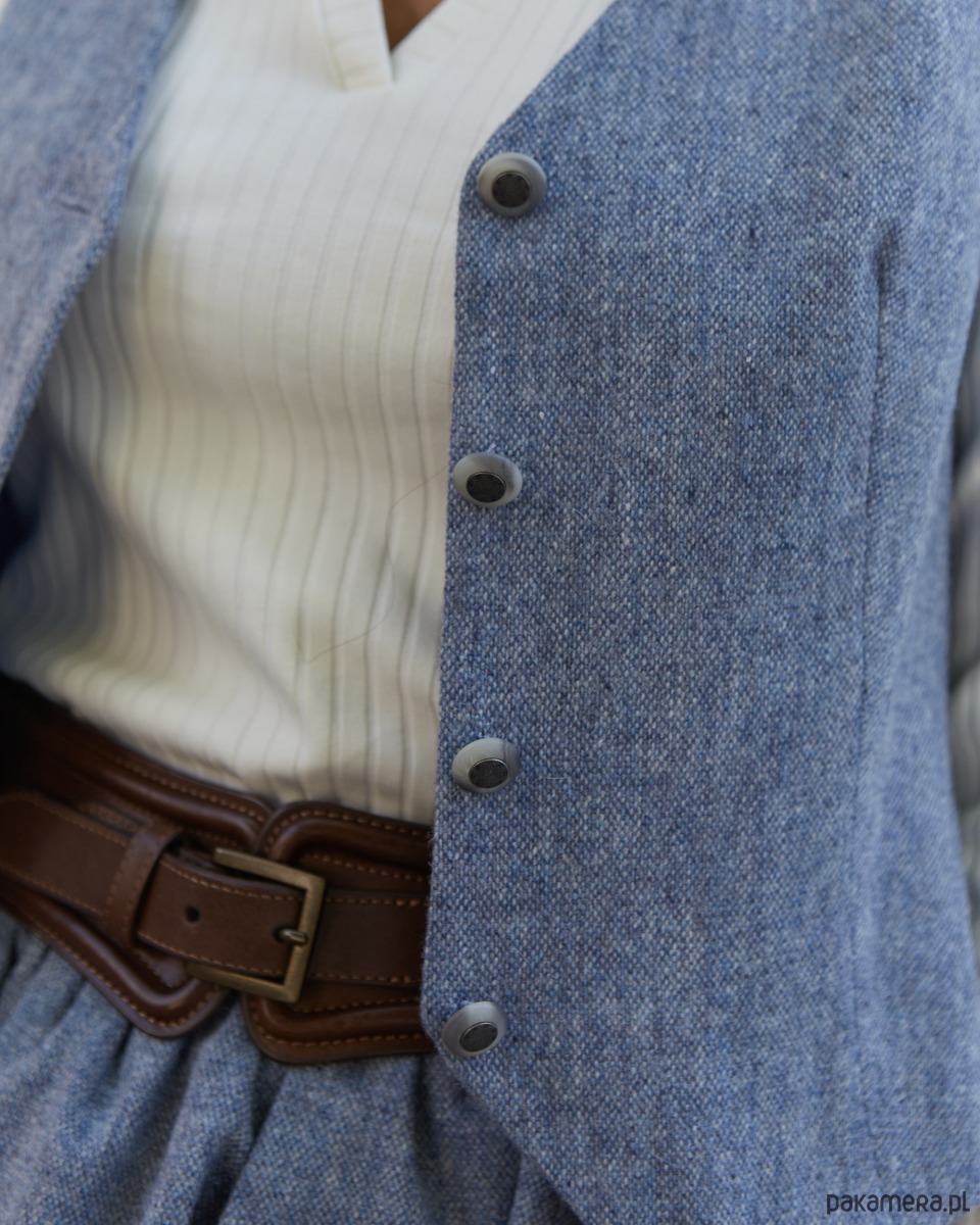 Kamizelka o klasycznym kroju, uszyta z wysokogatunkowej, ciepłej wełny w kolorze błękitnym na wiskozowej podszewce. Idealnie skrojona i perfekcyjnie uszyta. Można ją nosić zapiętą lub rozpiętą. Z tyłu regulowana. Jest idealnym uzupełnieniem każdej stylizacji. Pasuje zarówno do spodni, jak i spódnic. To model, który znakomicie prezentuje się z prostymi jeansami, jak i z zawadiacką rozkloszowaną spódnicą. Naturalny materiał sprawia, że kamizelka świetnie nadaje się na każdą porę roku. Występuje w trzech rozmiarach XS/S, M oraz L. Wyprodukowana w Polsce, w kameralnej pracowni pod Warszawą. Idealna do kompletu ze spódnicą Iris Beż Bis. Garmatura wełny: 280 g/m2.