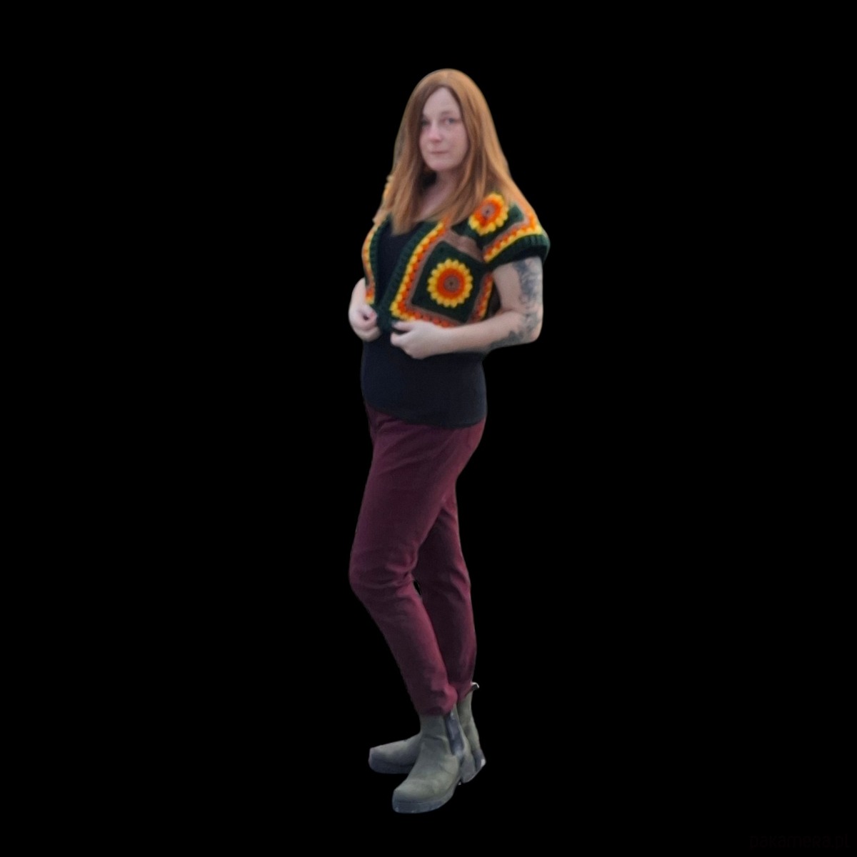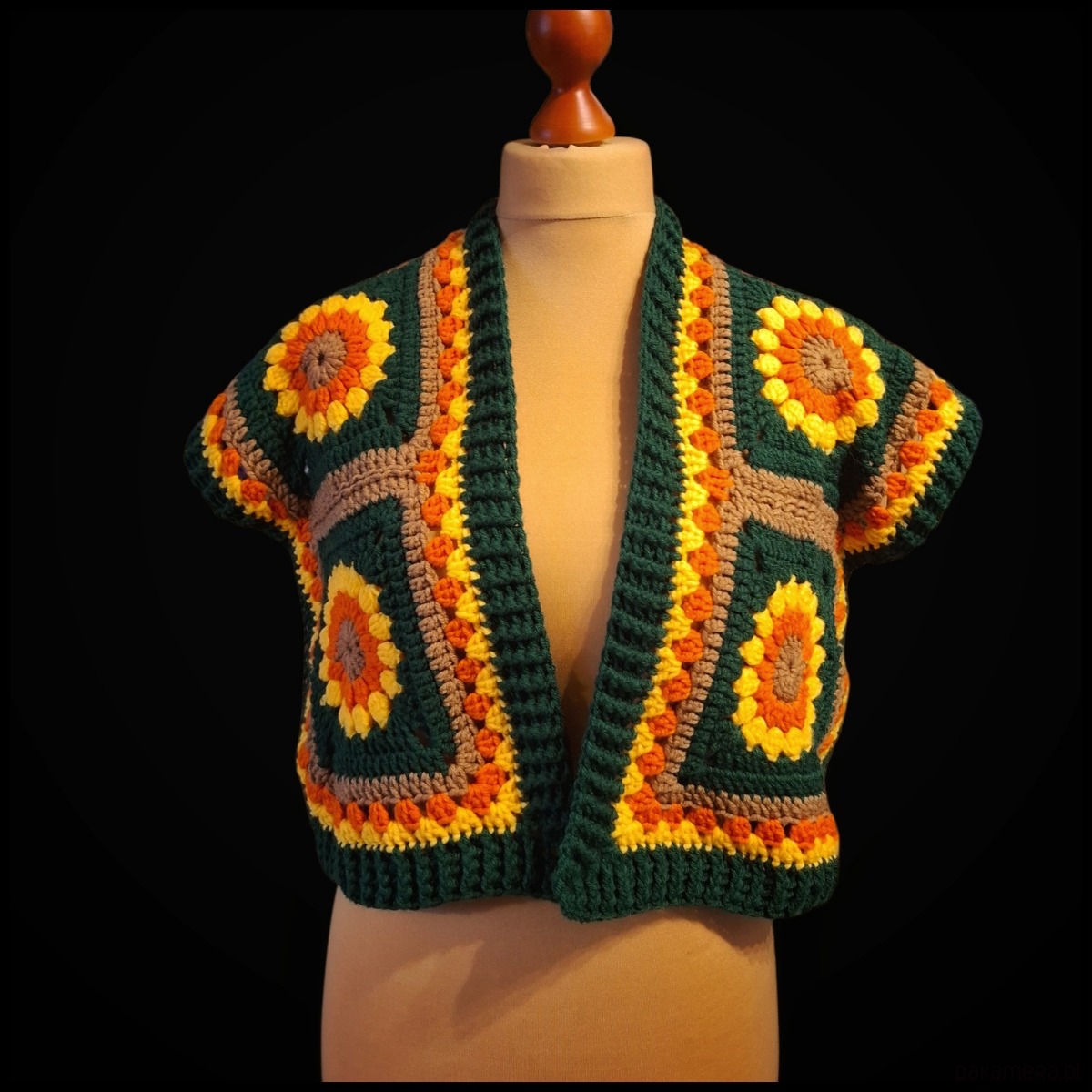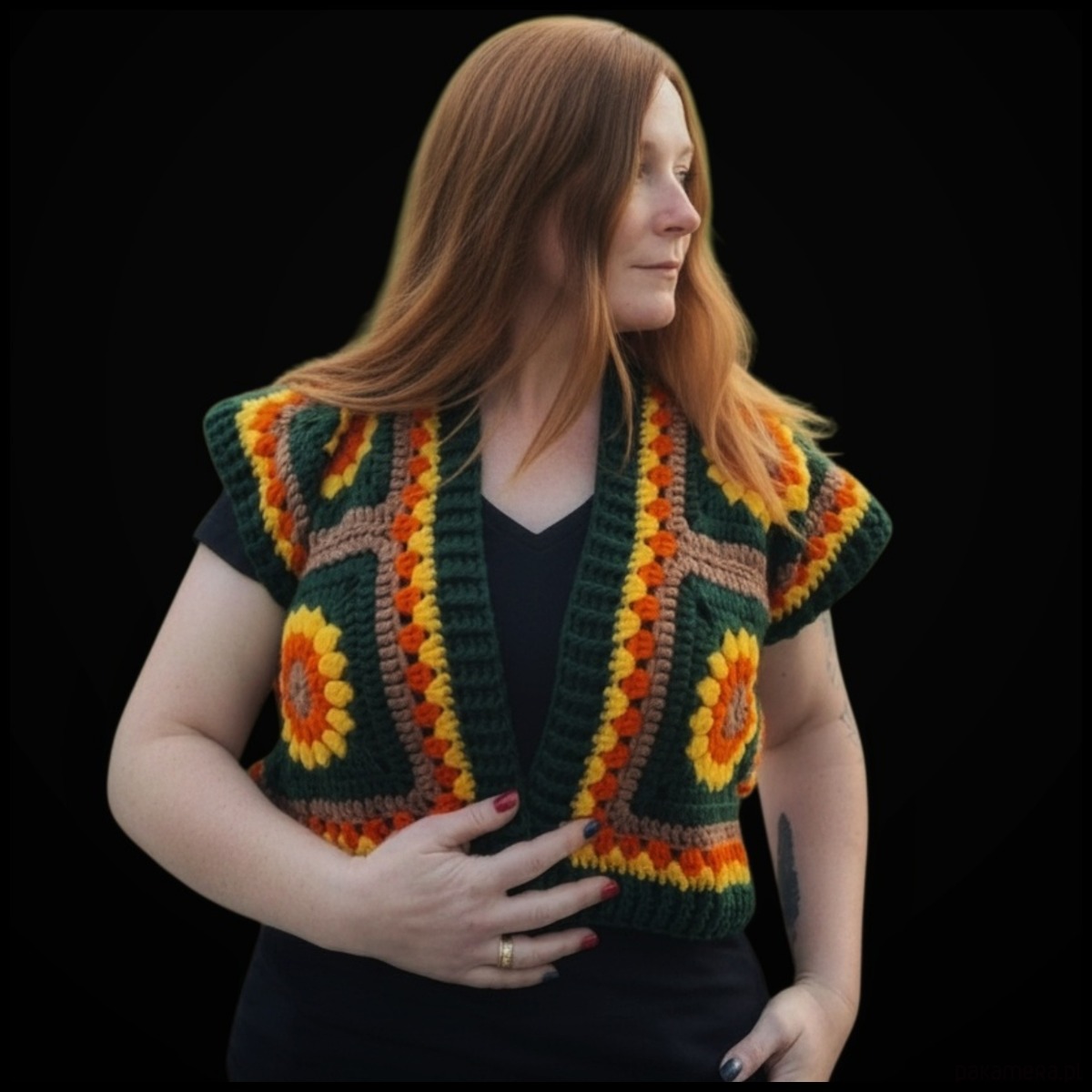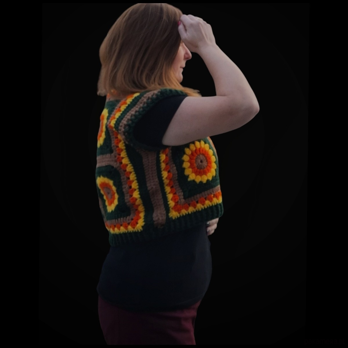 Ta unikatowa kamizelka została wykonana ręcznie metodą szydełkowania z wysokiej jakości włóczki akrylowej. Połączenie intensywnych barw – pomarańczowego, żółci i zielonego i ciepłego brązu – nadaje jej wyjątkowy retro charakter. Idealna na spacery oraz na chłodniejsze dni, do stylizacji codziennych, festiwalowych i boho. Świetnie komponuje się z jeansami, szortami i trampkami.