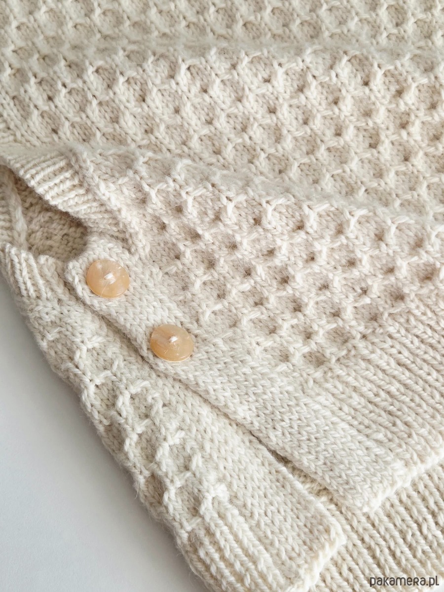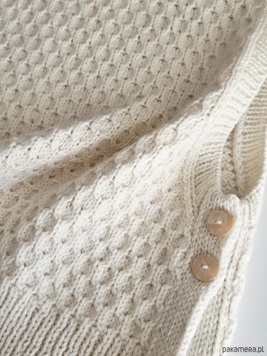 Wybrałam dla niego kultową włóczkę Drops Nepal (mieszanka wełny i alpaki). To ten przypadek, kiedy ubranie nie tylko grzeje, ale daje poczucie otulenia. Strukturalny wzór dodaje objętości, a guziki po bokach — wyjątkowego charakteru.