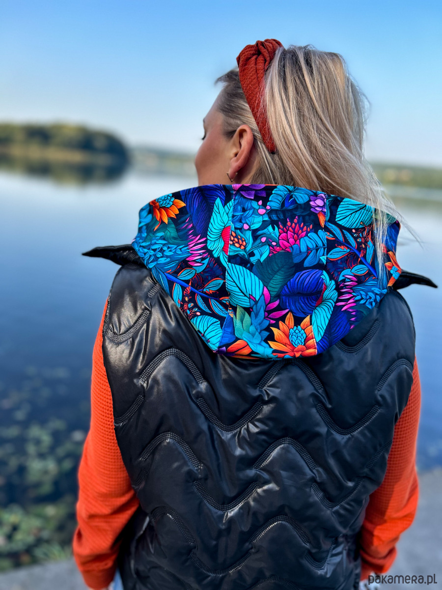 Całość tworzy kamizelkę o większej grubości – puchówka. Materiał pikowany sonicznie, czyli bez użycia nici, zapobiega przeciekaniu wody. Wzór bumerangi.
