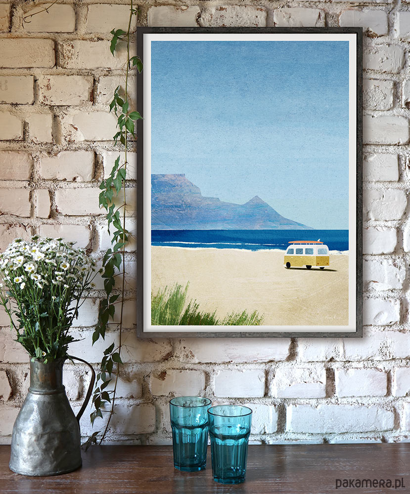 Plakat Kamper na plaży - surfing - to przedstawienie idealnych wakacje. Kamper z deską surfingową na dachu w otoczeniu morskiego krajobrazu, to kwintesencja beztroskiego lata. Z morską grafiką na ścianie łatwo pamiętać, że gdzieś na świecie jest zawsze lato.