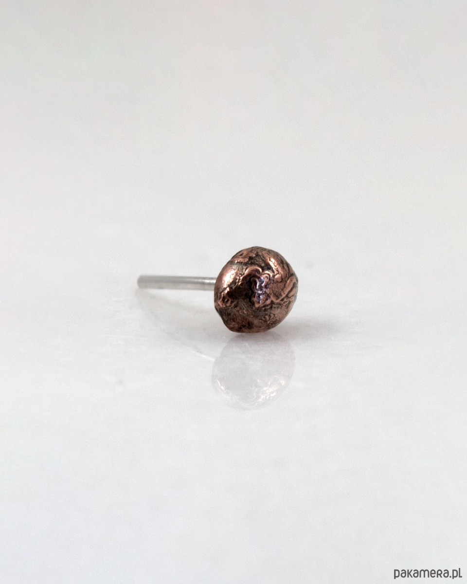 Wykonany ręcznie z miedzi i srebra próby 925. Srebrna zatyczka. Faktura podkreślona ciemną patyną uzyskaną w procesie oksydacji (bez użycia barwników). Wielkość "oczka" to ok. 8 mm.