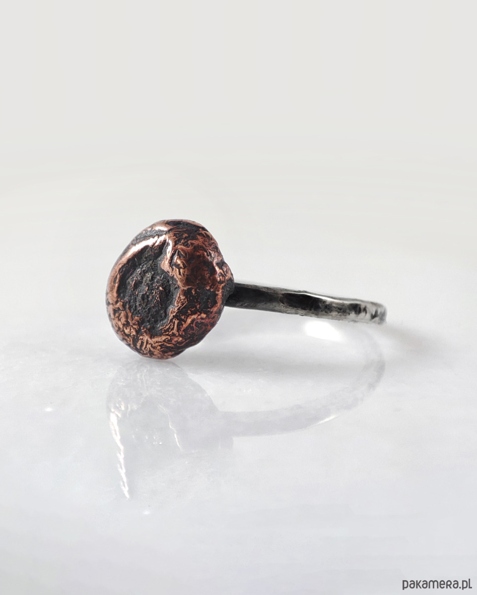 Pierścionek powstał w jednym egzemplarzu. Biżuterię wykonuję od podstaw przy użyciu prostych narzędzi. Ręczne wykonanie cechuje lekka nieregularność, a zarazem niepowtarzalność każdego przedmiotu.