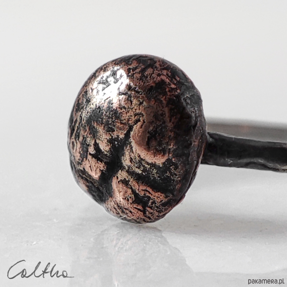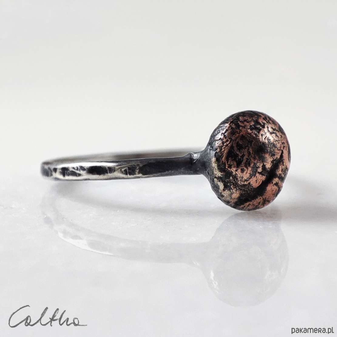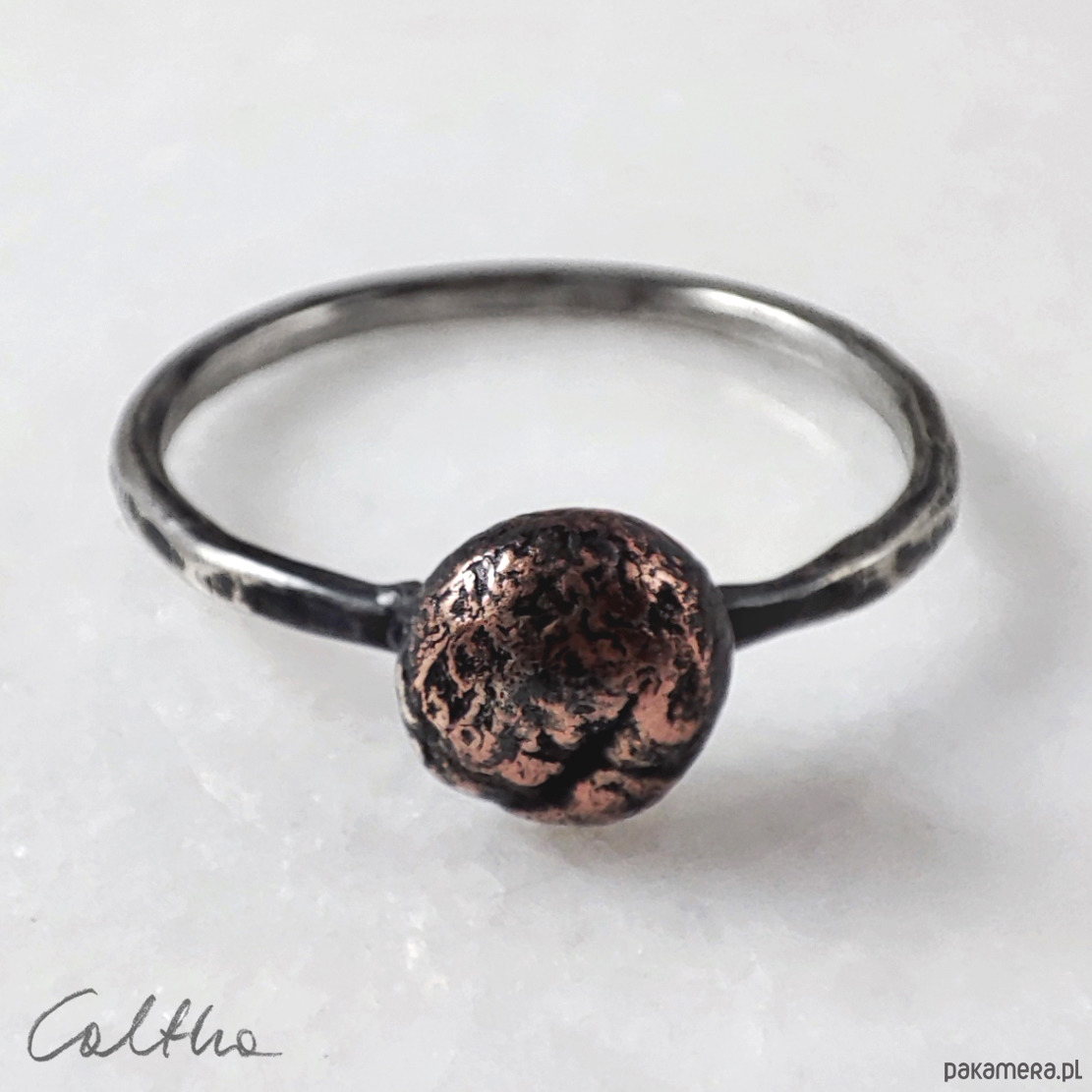 Pierścionek powstał w jednym egzemplarzu. Biżuterię wykonuję od podstaw przy użyciu prostych narzędzi. Ręczne wykonanie cechuje lekka nieregularność, a zarazem niepowtarzalność każdego przedmiotu.