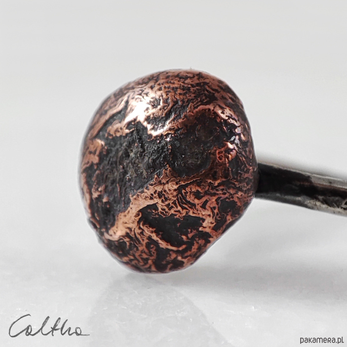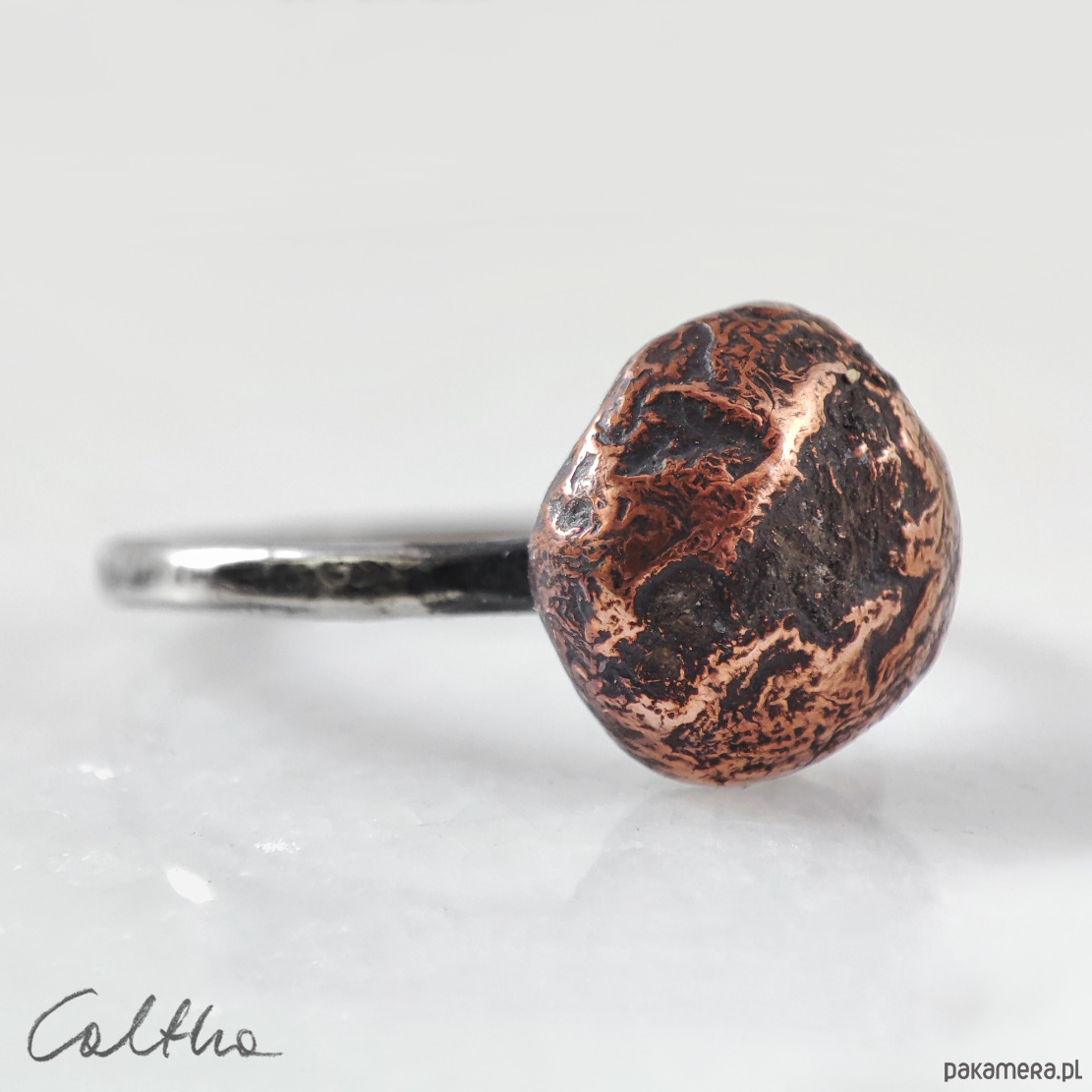 Pierścionek powstał w jednym egzemplarzu. Biżuterię wykonuję od podstaw przy użyciu prostych narzędzi. Ręczne wykonanie cechuje lekka nieregularność, a zarazem niepowtarzalność każdego przedmiotu.