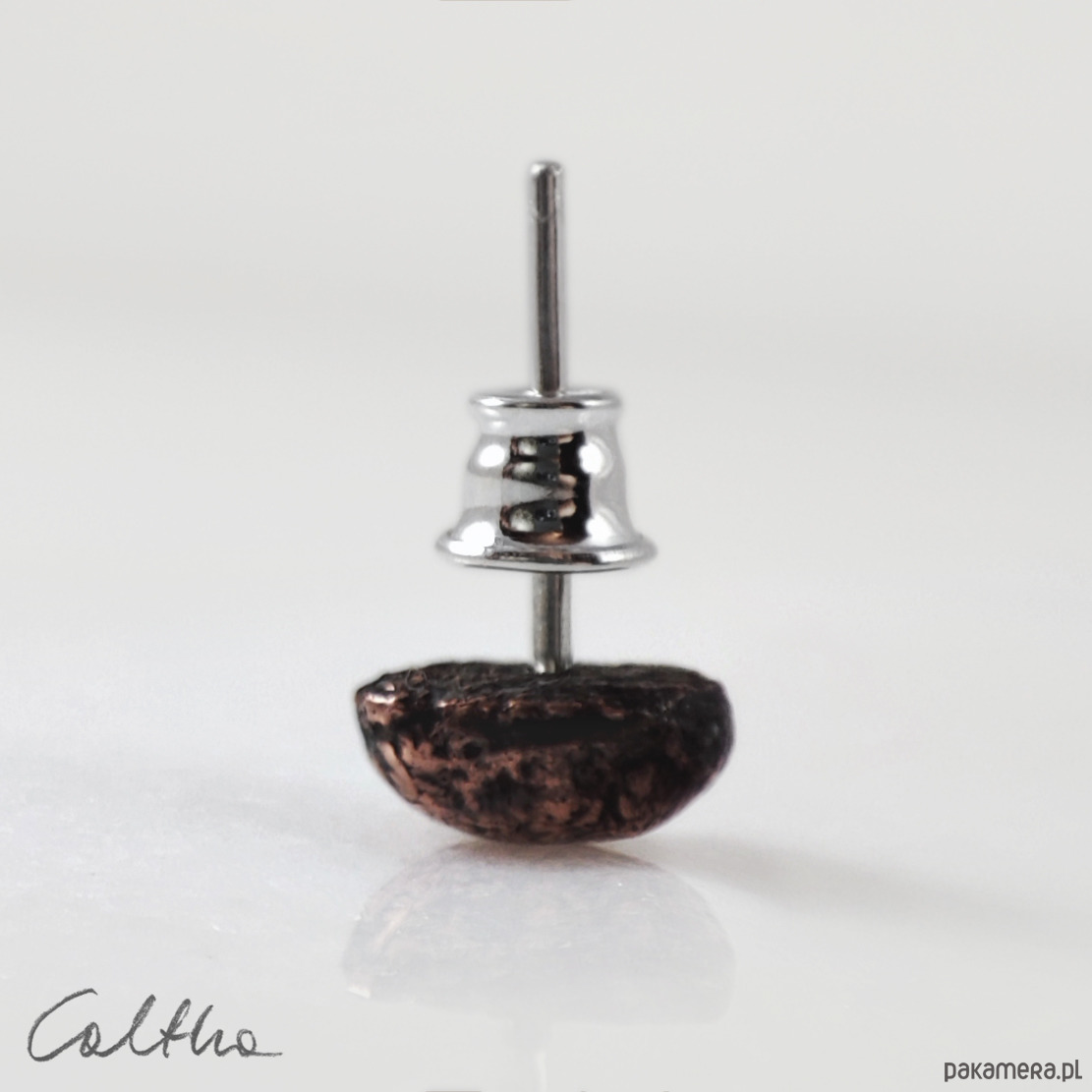 Wykonane ręcznie z miedzi i srebra próby 925. Srebrne zatyczki. Faktura została podkreślona ciemną patyną uzyskaną w procesie oksydacji (bez użycia barwników). Wielkość "oczka" to ok. 6 mm.
