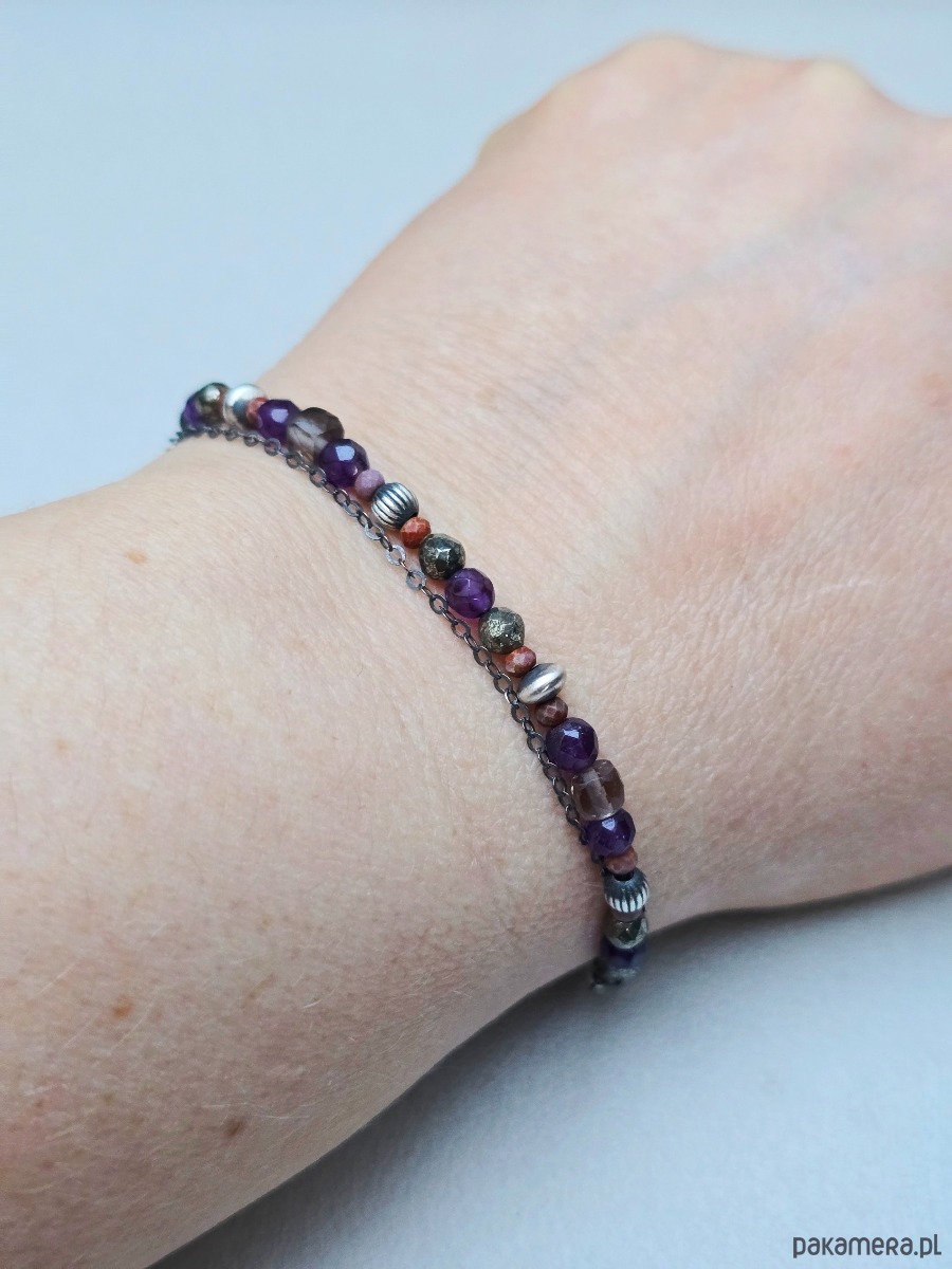 Delikatna, podwójna bransoletka z zawieszkami. Wykonana z kamieni naturalnych 3- 4mm tj.: ametyst, kwarc dymny, piryt, jaspis