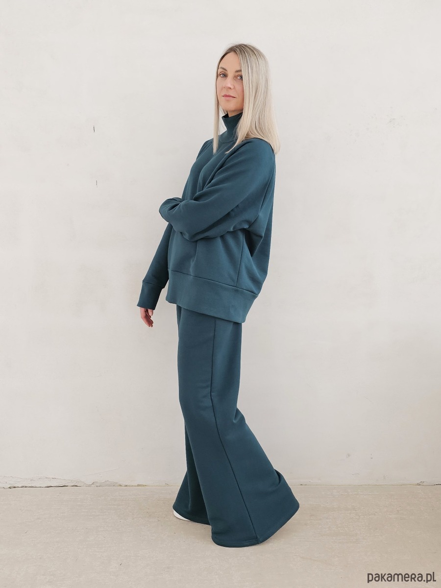 OPIS PRODUKTU- komfortowy komplet z naszego sygnowanego materiału superSOFT™. Bluza bardzo wygodna z luźnym golfem o lekko przedłużonym fasonie. Spodnie dzwony o lekko dopasowanym kroju. W pasie guma i sznurek do płynnej regulacji.