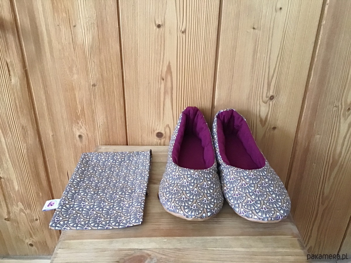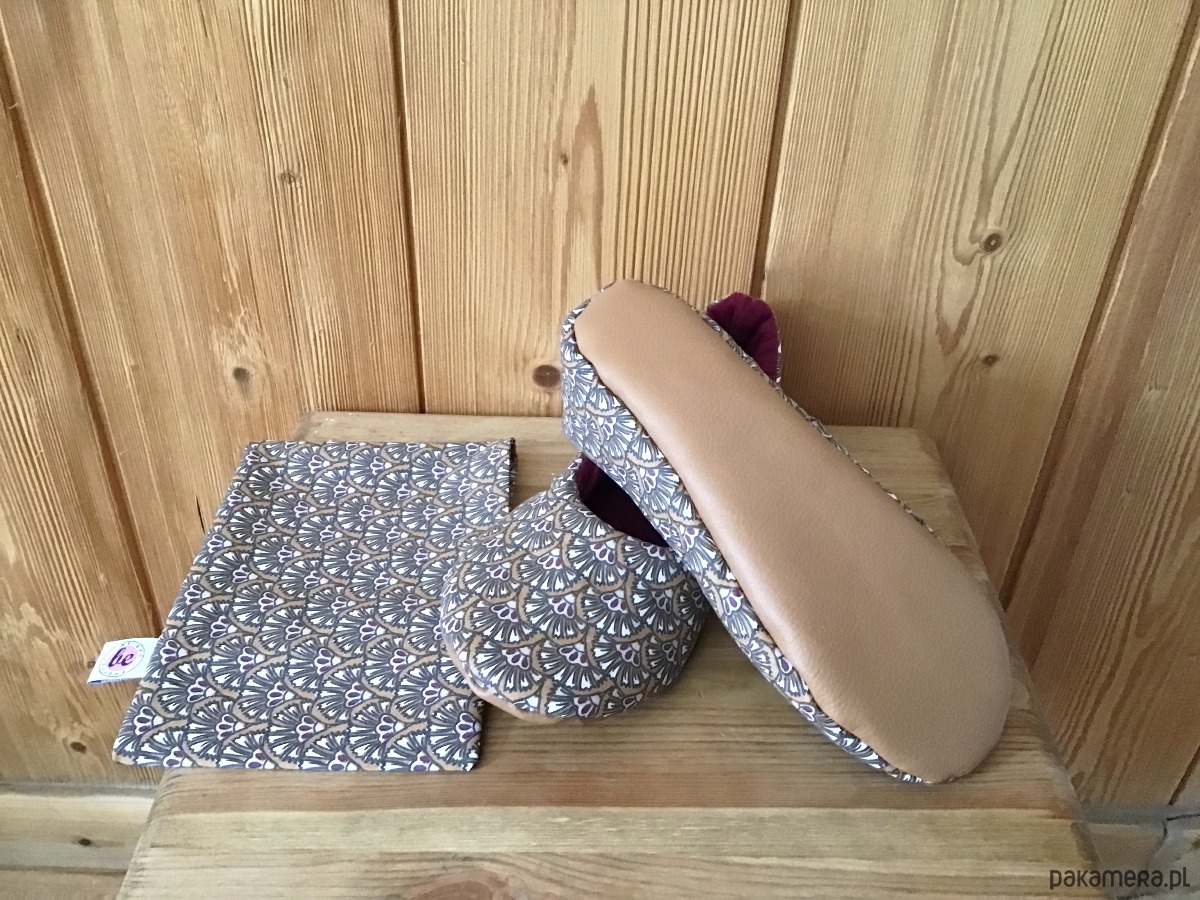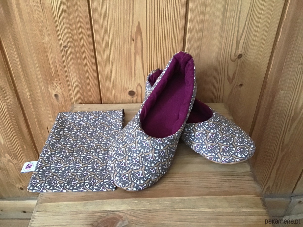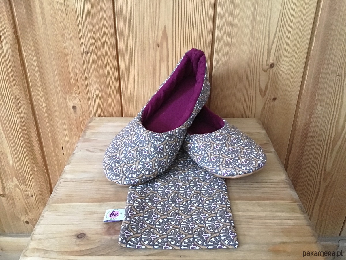 Mięciutkie kapcie wykonane z brązowej tkaniny z kwiatkami. Środek wykonany z miękkiej bordowo-wiśniowej flaneli, całość posiada miękkie wypełnienie. Kapcie posiadają antypoślizgową sztywniejszą podeszwę i sprzedawane są w ozdobnym woreczku. Buciki są bardzo wygodne idealne na zmęczone stopy. Prać w temp. 30°