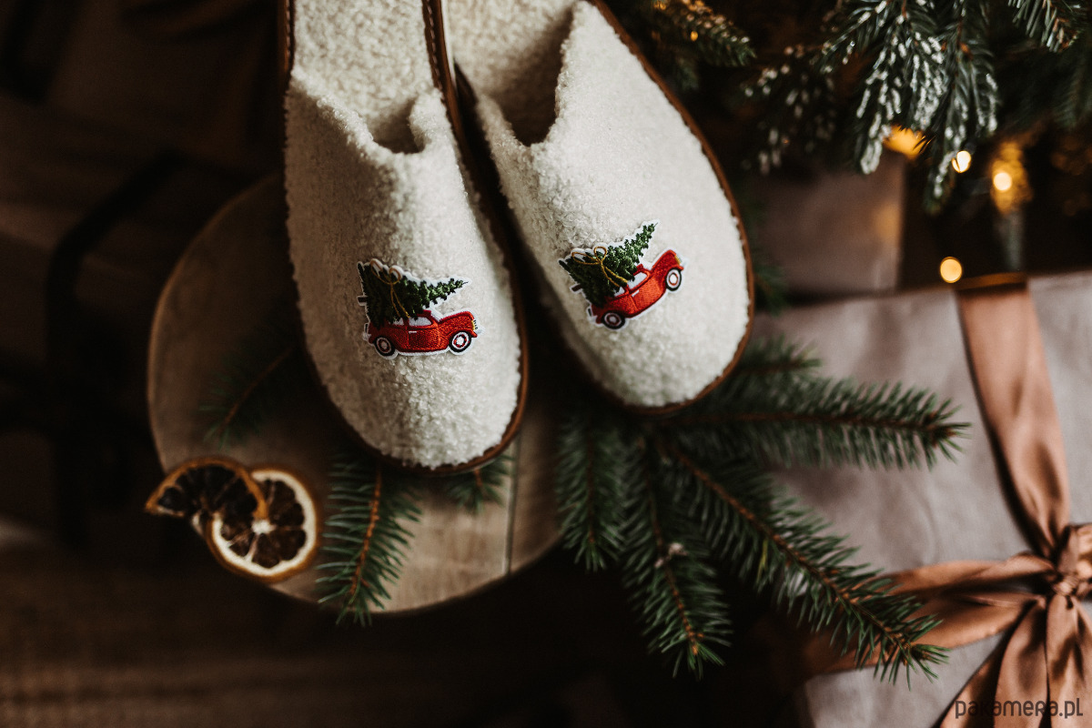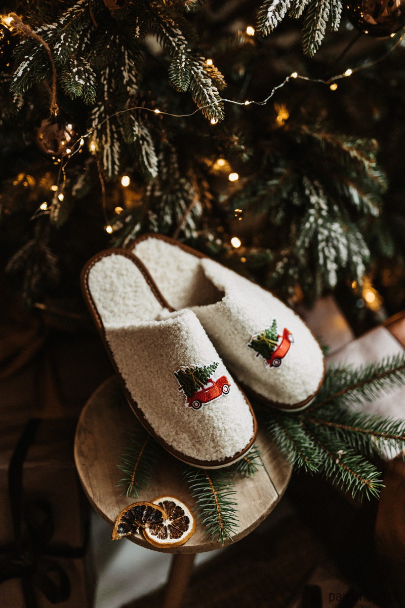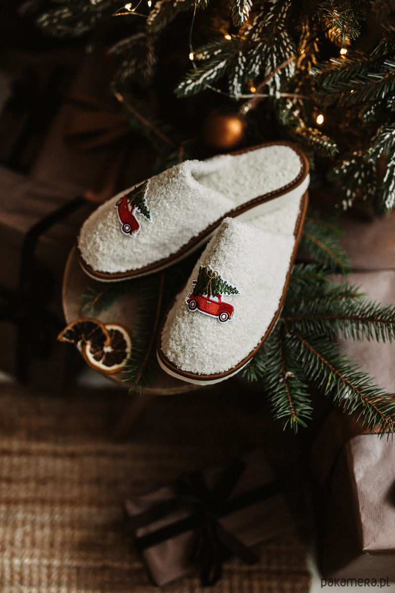 Te kapcie są idealne dla wszystkich, którzy już w listopadzie nucą "Last Christmas". Są mięciutkie, ciepłe i pełne świątecznego uroku. Te kapcie to prawdziwy " domowy hygge klasyk" - otulają stopy miękką tkaniną, a ich świąteczna aplikacja z czerwonym autkiem i choinką przypomina najbardziej magiczny moment grudnia: kiedy choinka jedzie do domu...