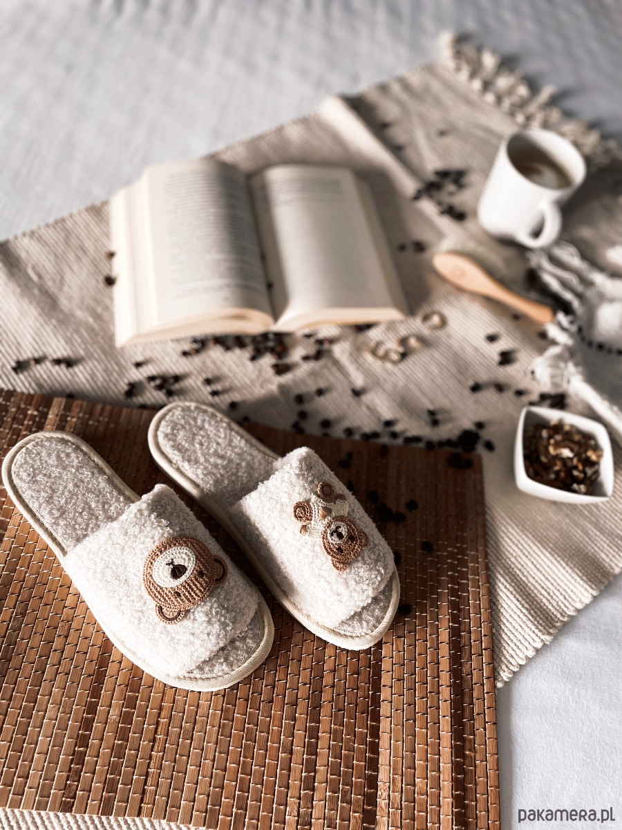 Przytulne kapcie domowe, które od pierwszego kroku wywołują uśmiech. Wykonane z miękkiego materiału, ozdobione szydełkowym misiem, dodają ciepła i uroku codziennym chwilom w domu.
