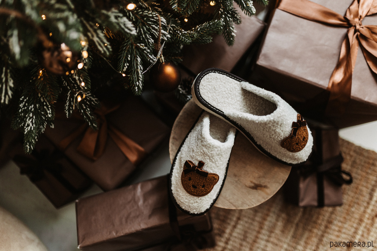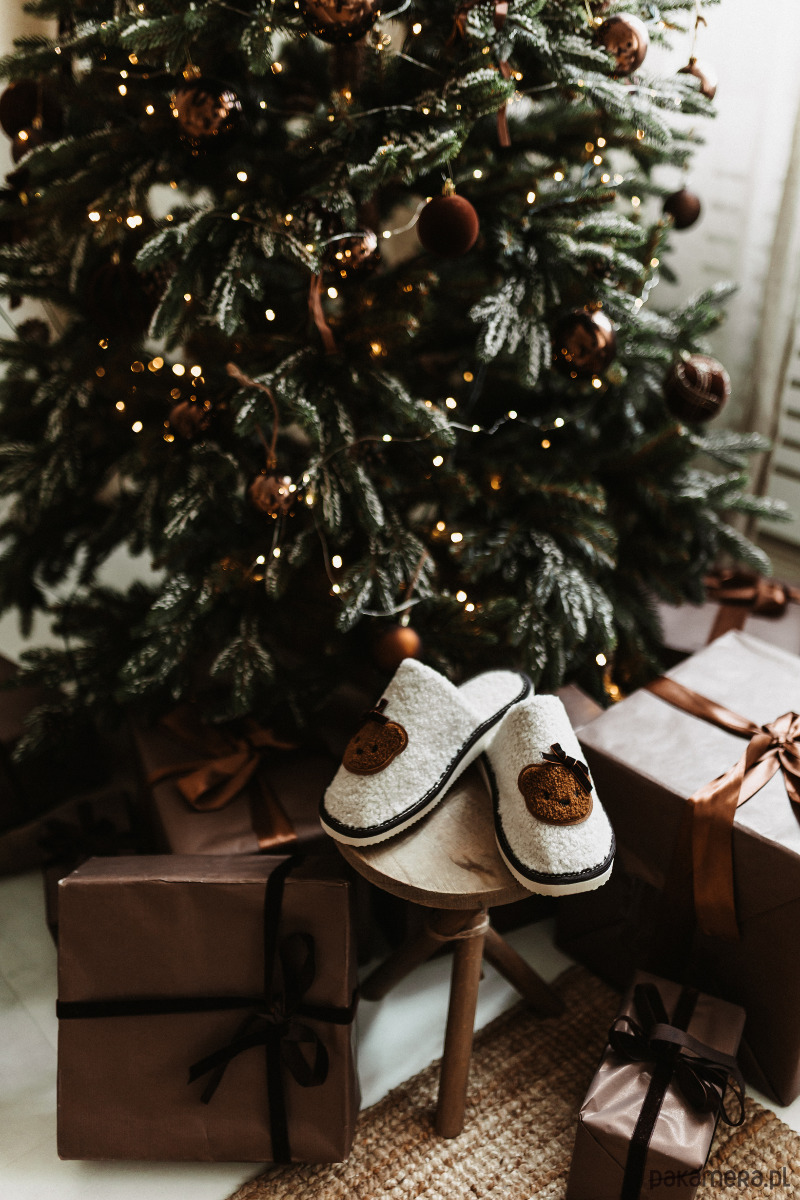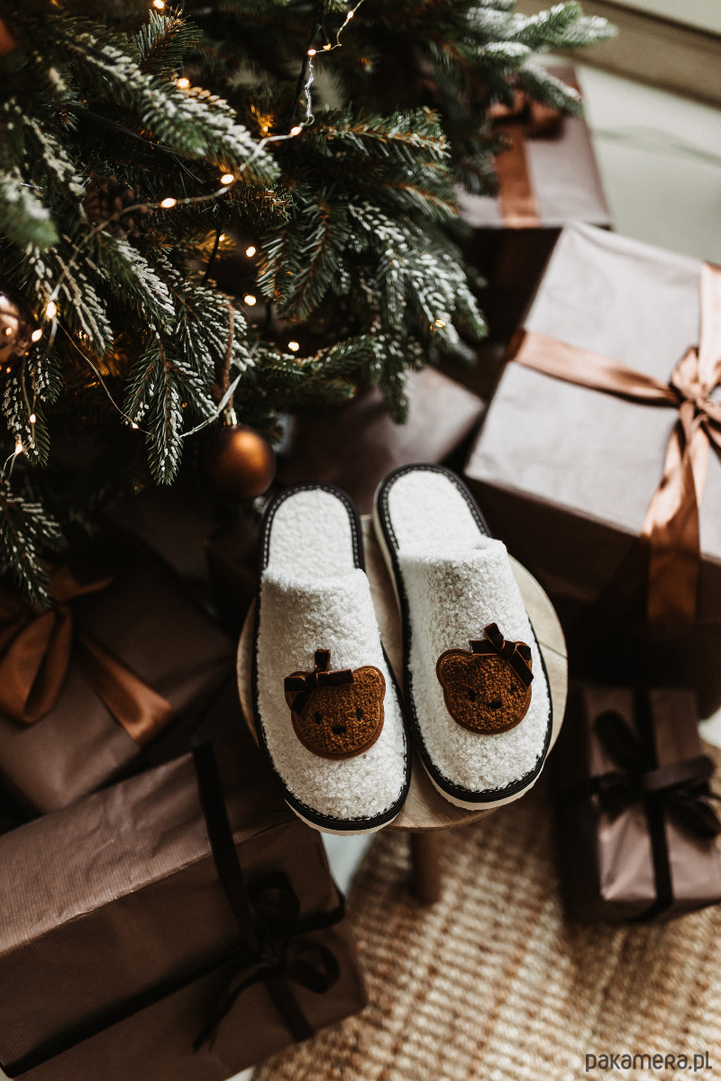 Pani Miś się przystroiła kokardką. Jest gotowa na Święta. A Twoje stopy - na ciepło. Te kapcie to taki domowy "uśmiech". Miękkie, przytulne, zrobione ręcznie. Nie świecą, nie grają kolęd ale po prostu są miłe i to wystarcza w ten świąteczny czas.