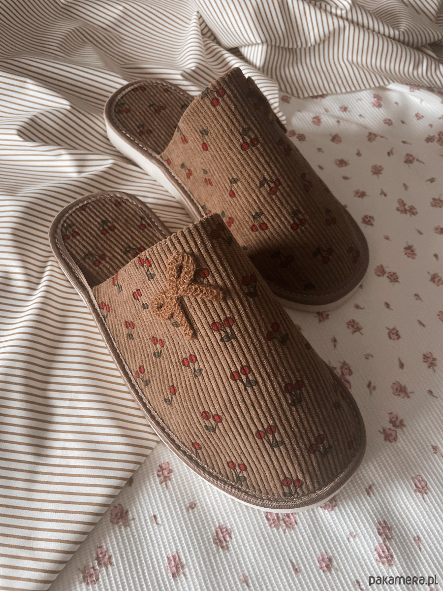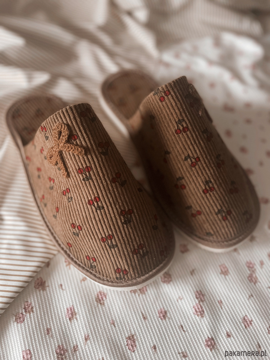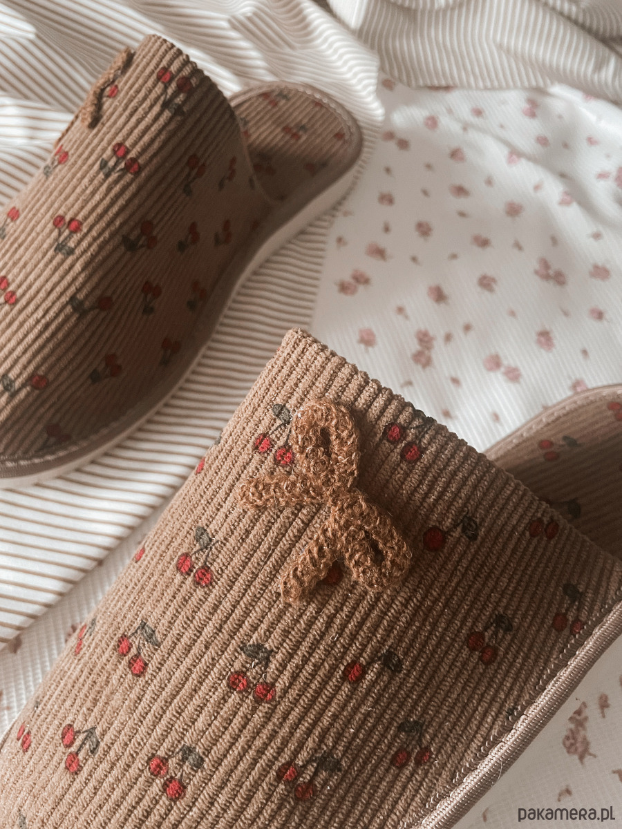 Kapcie dla niej pełne z nadrukiem Cherry z brązową kokardą