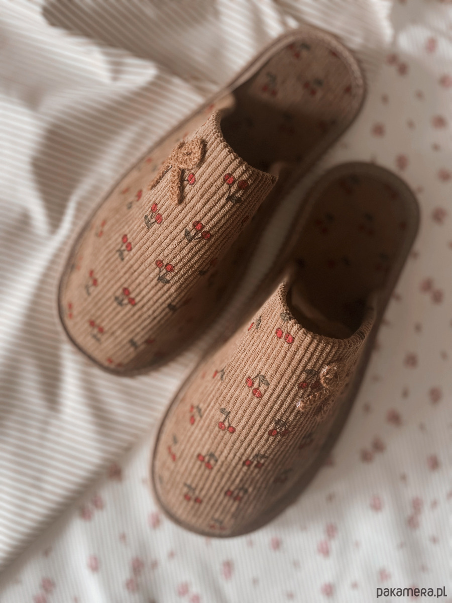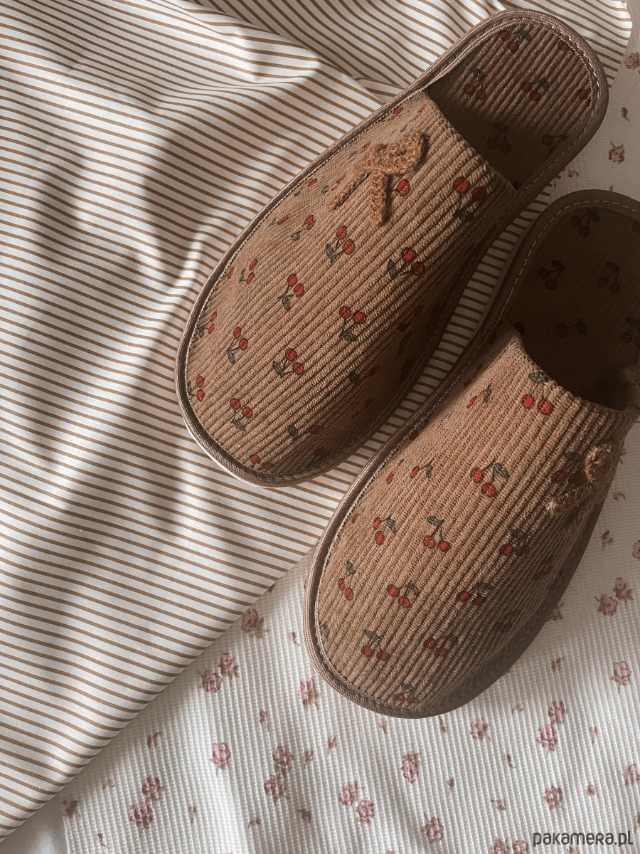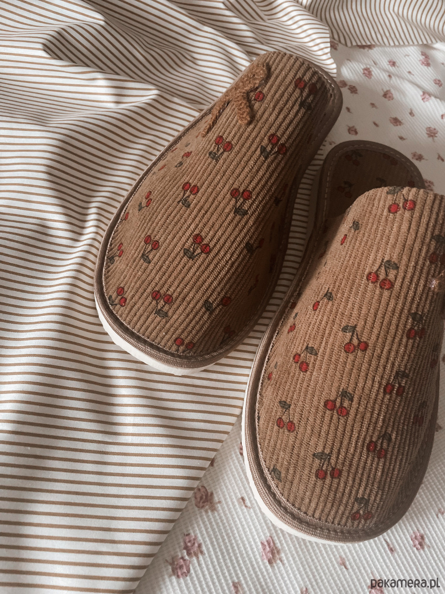 Kapcie dla niej pełne z nadrukiem Cherry z brązową kokardą