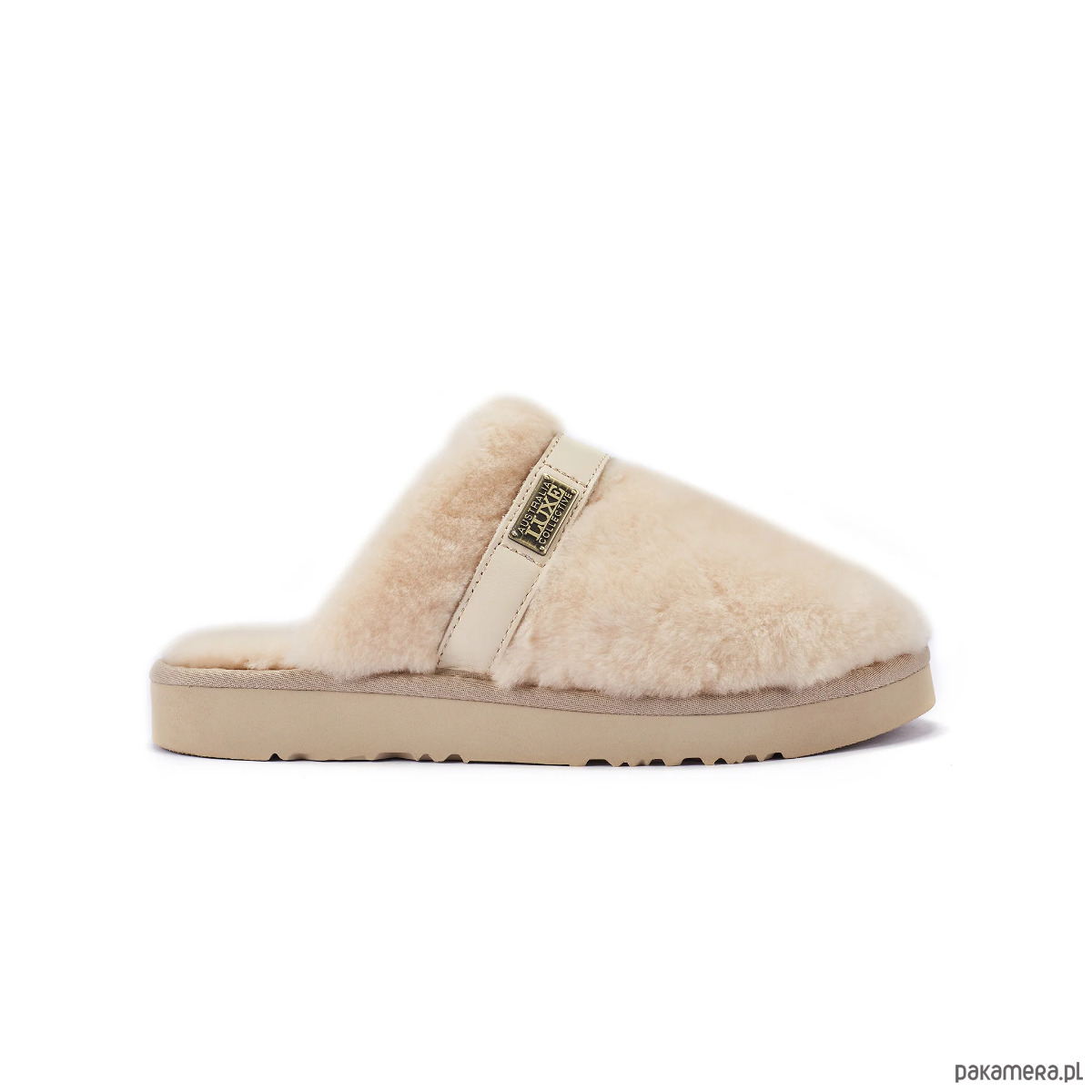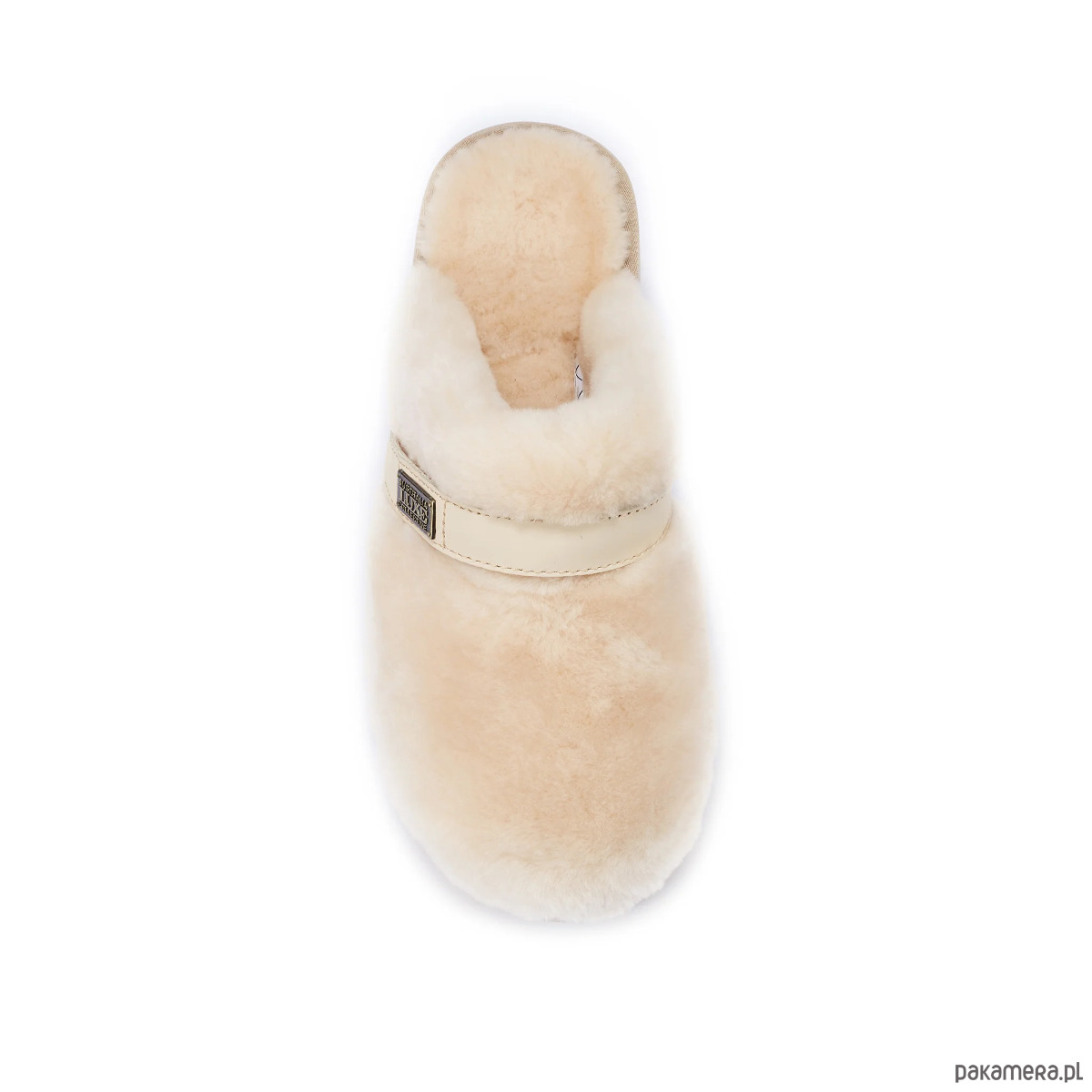 Wsuwane pantofle typu mule z niską podeszwą. Dwustronna skóra owcza z luksusowym sztucznym futerkiem i skórzanym paskiem na przyszwie.