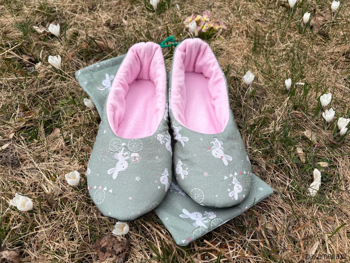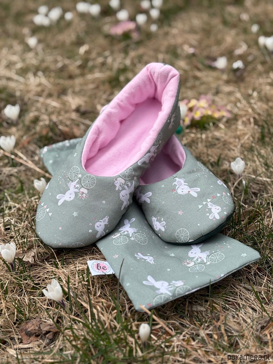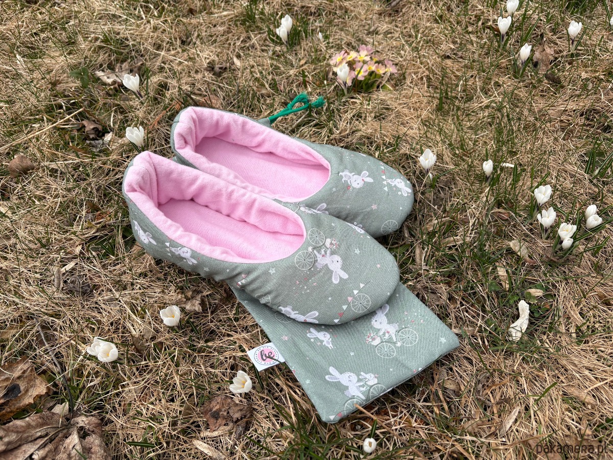 Mięciutkie kapcie wykonane z szarozielonej bawełny z motywem królików. Środek wykonany z miękkiej różowej flaneli, całość posiada miękkie wypełnienie. Kapcie posiadają antypoślizgową sztywniejszą podeszwę i sprzedawane są w ozdobnym woreczku. Buciki są bardzo wygodne idealne na zmęczone stopy. Prać w temp. 30°
