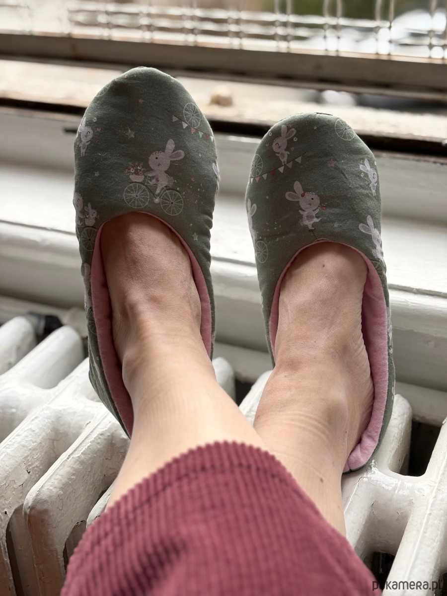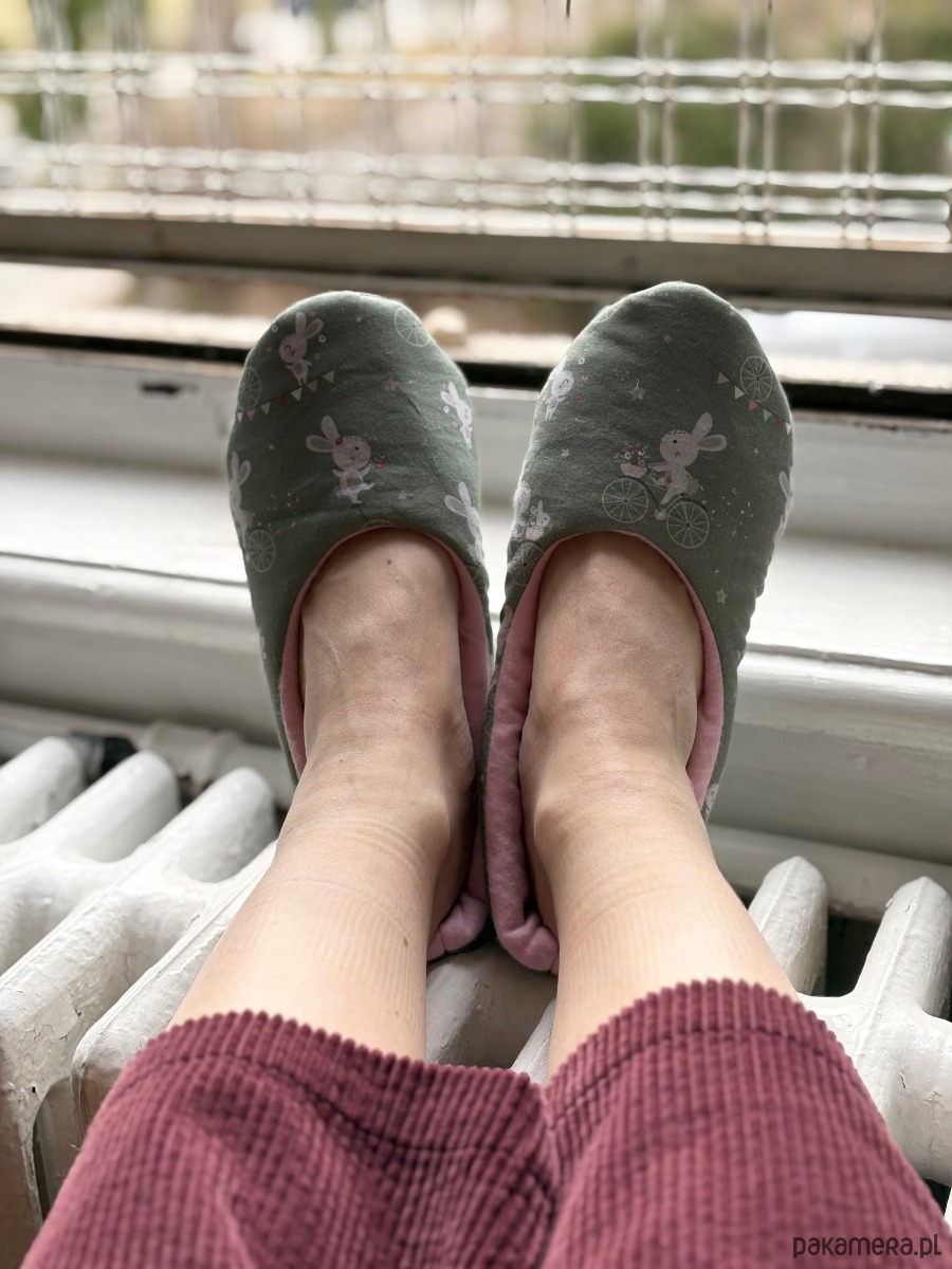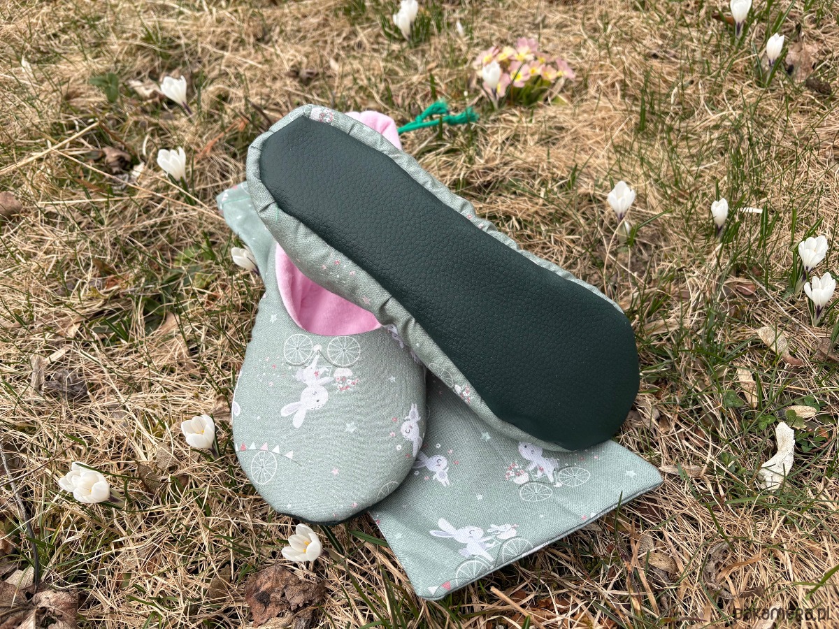Mięciutkie kapcie wykonane z szarozielonej bawełny z motywem królików. Środek wykonany z miękkiej różowej flaneli, całość posiada miękkie wypełnienie. Kapcie posiadają antypoślizgową sztywniejszą podeszwę i sprzedawane są w ozdobnym woreczku. Buciki są bardzo wygodne idealne na zmęczone stopy. Prać w temp. 30°