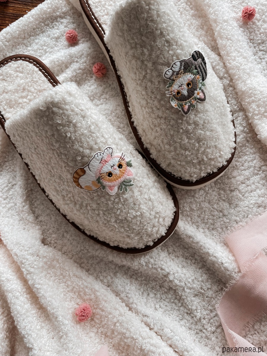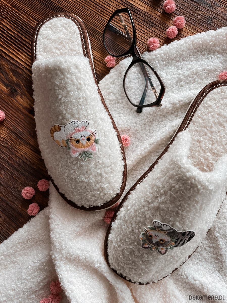 Miękkie otulające stopy jak ulubiony koc. Koci motyw dodaje im charakteru. To nie są zwykłe kapcie.