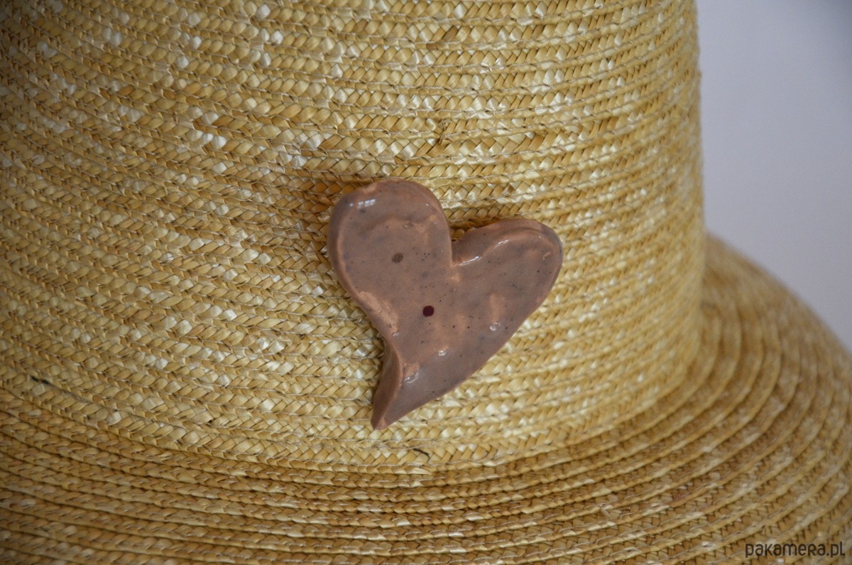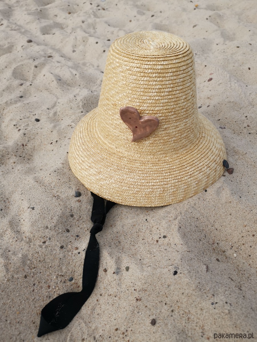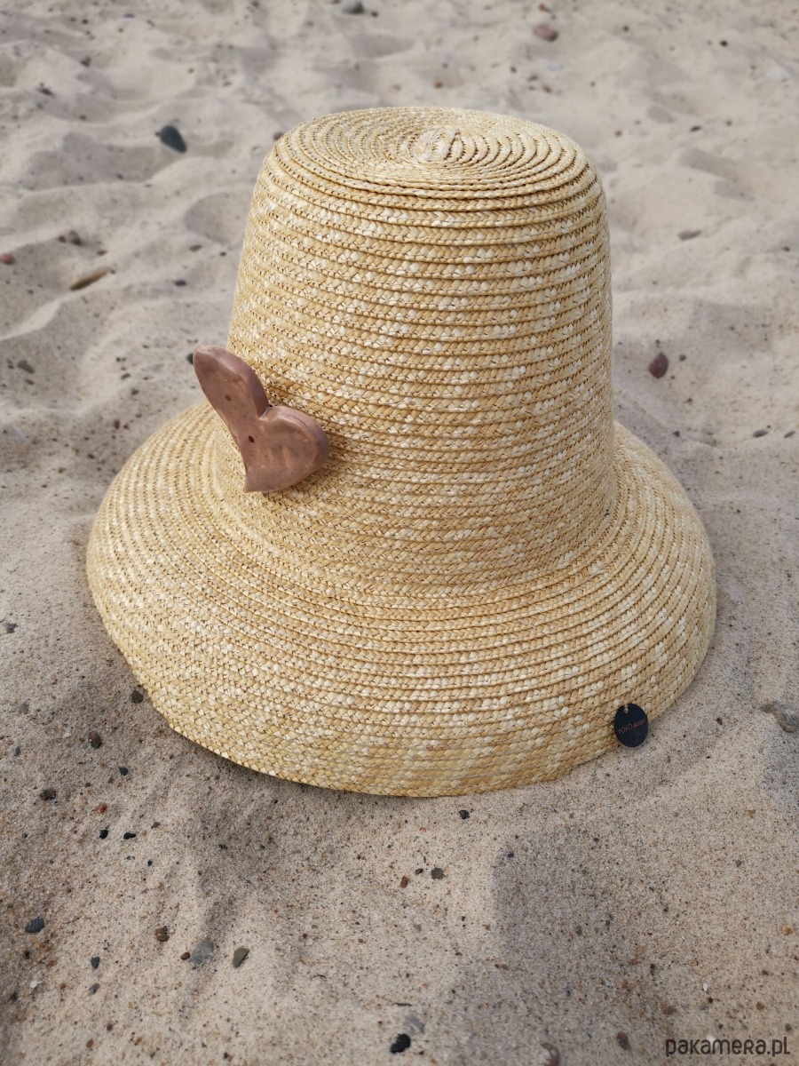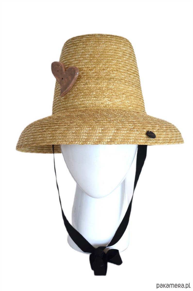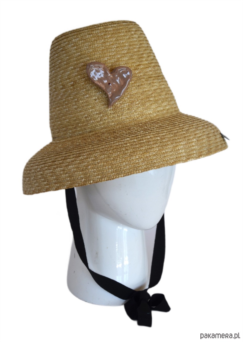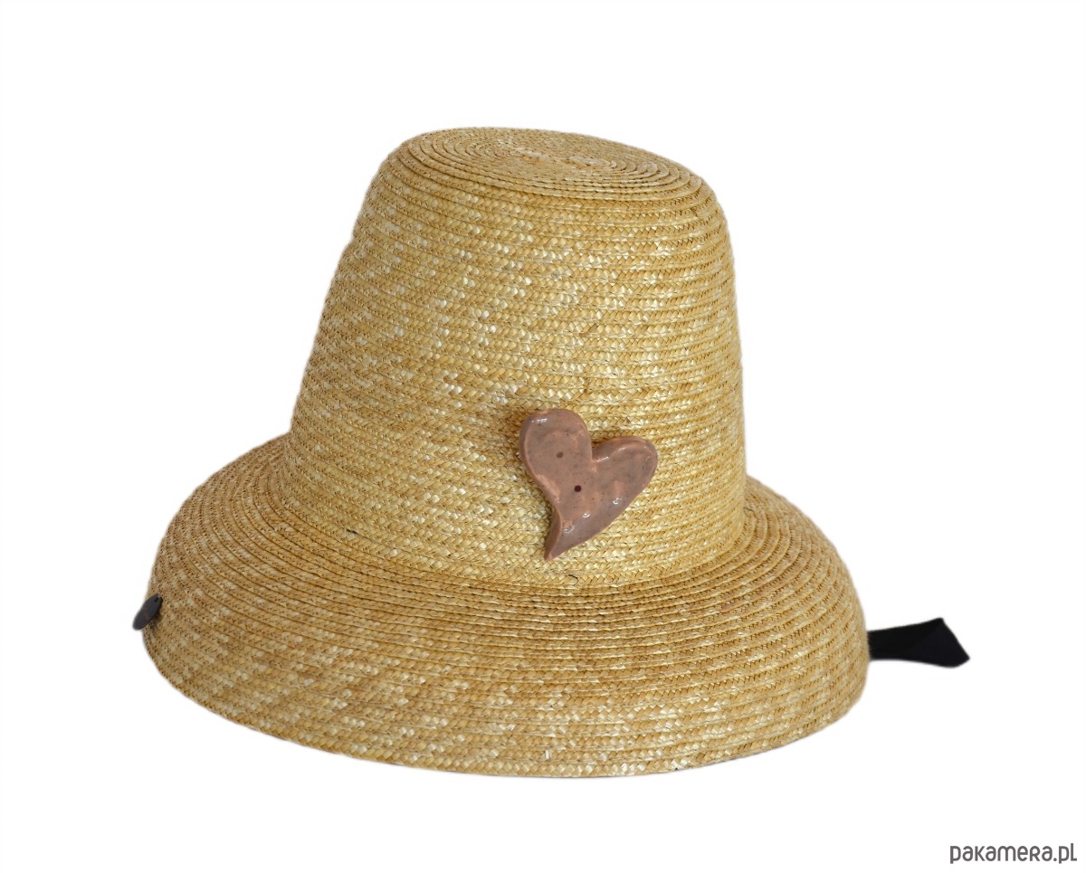 Kapelusz szyty ze słomy pszenicznej. Kolor naturalny. Rozmiar 56cm . Kapelusz typu klosz z wysoką główką i spuszczonym rondem. Posiada czarną tasiemkę. Zdobiony ceramiczną broszką ręcznie robioną.