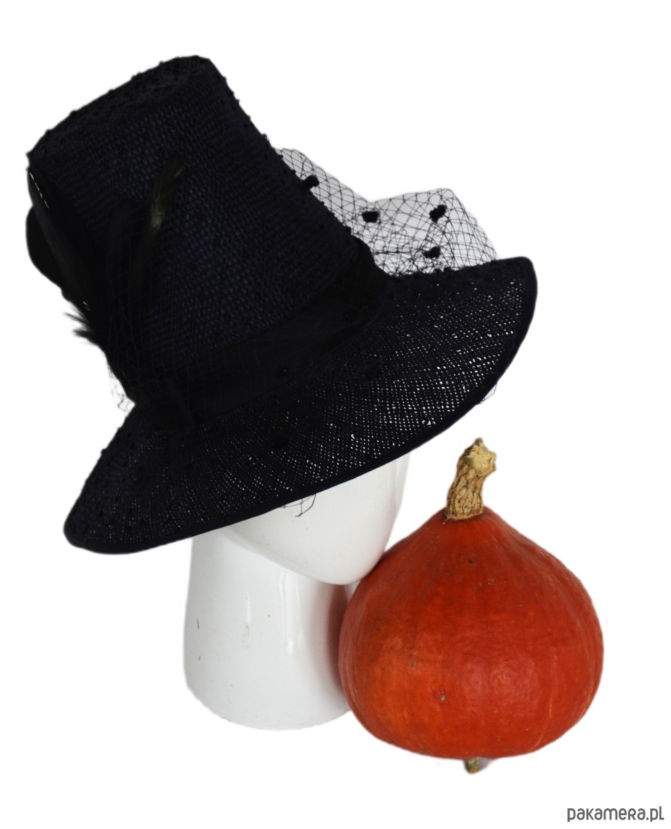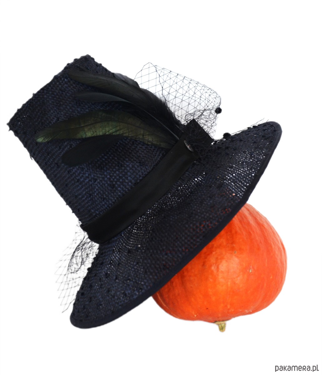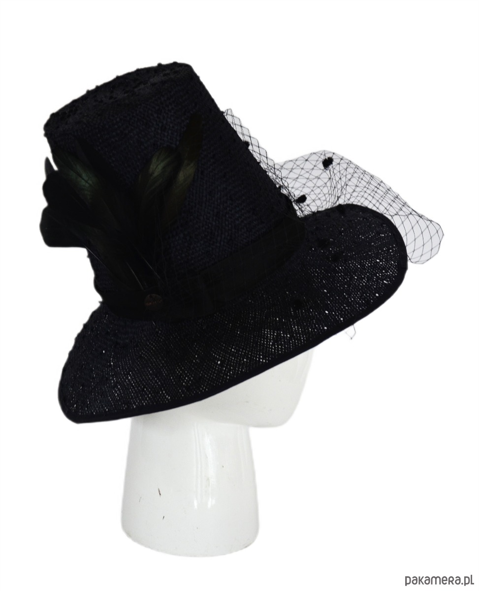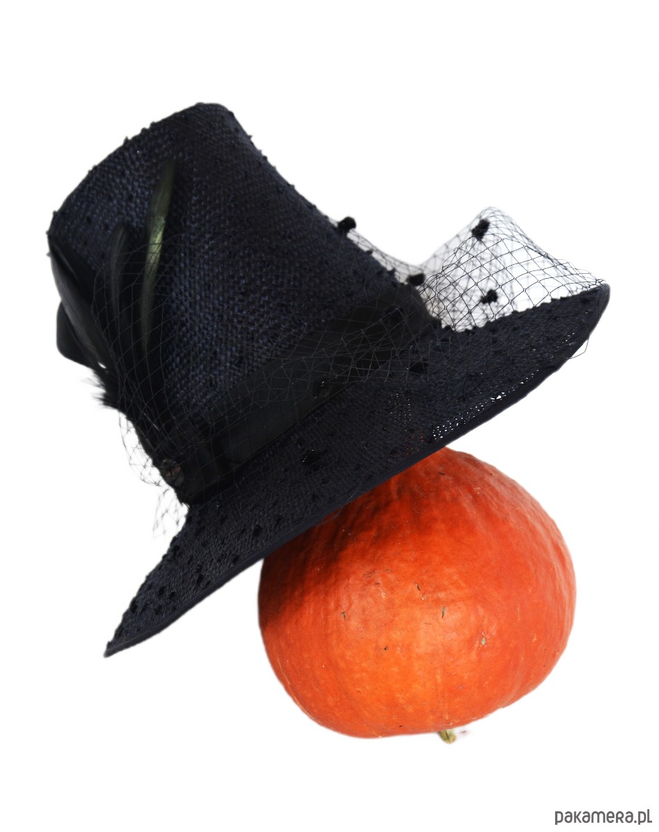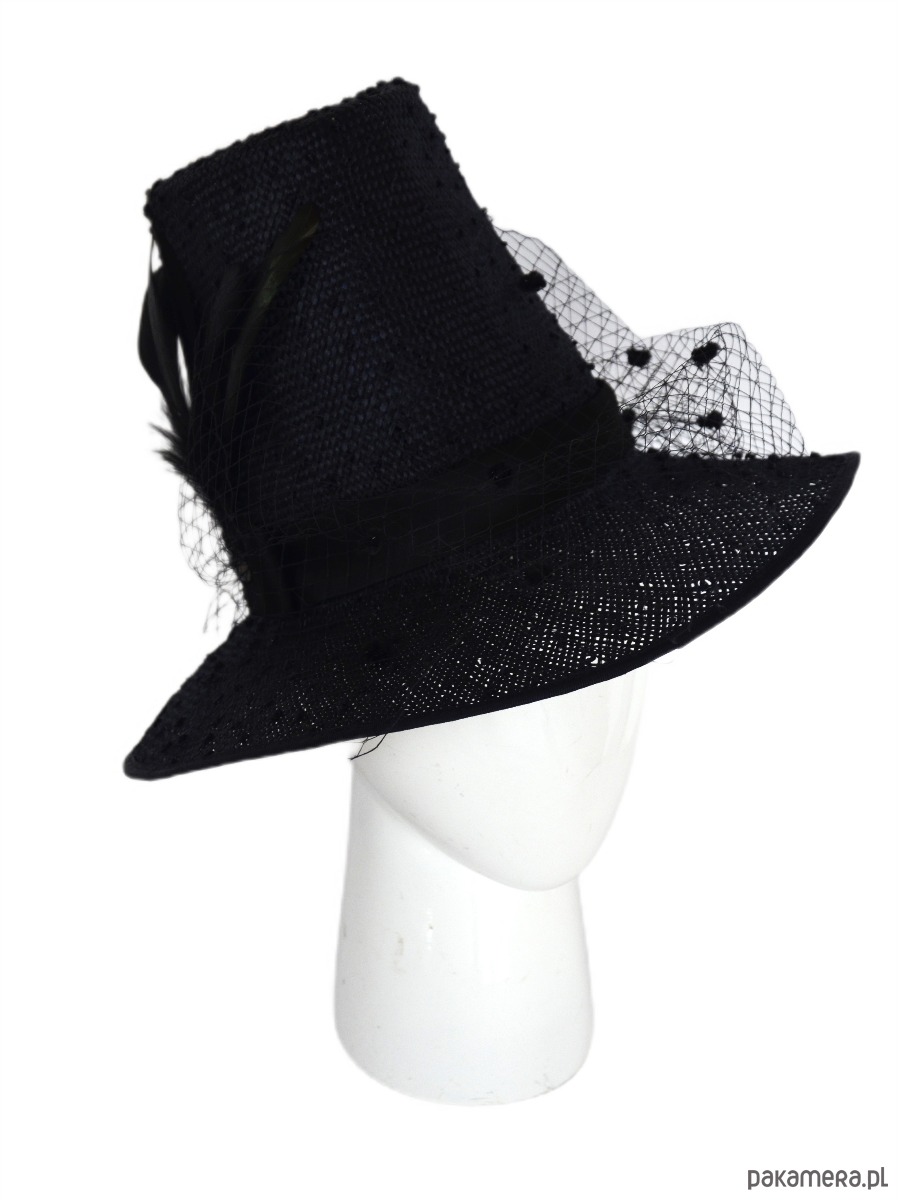 Kapelusz zdobiony satynowym otokiem, woalką z pomponami i piórami.