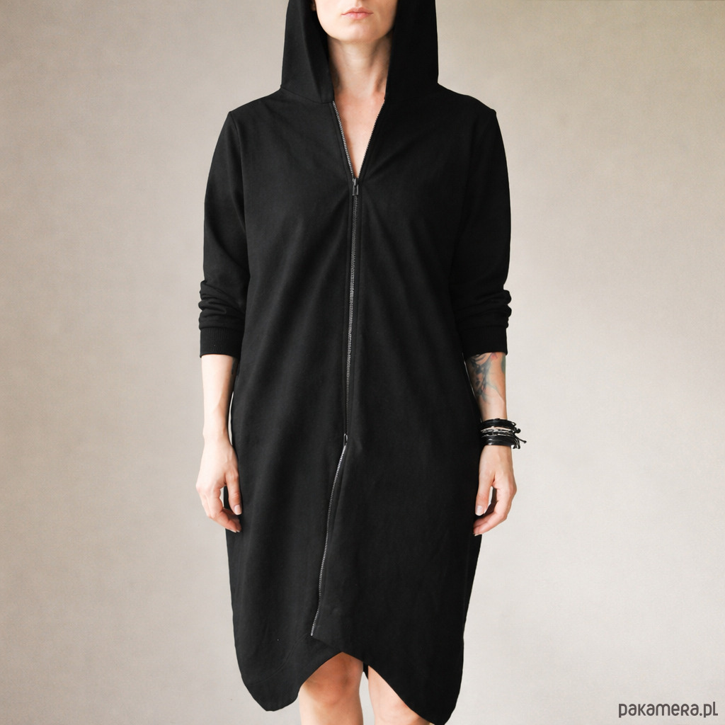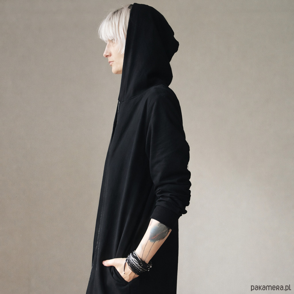 Czarny długi kaptur rozpinany. Oversize’owy, lekko nonszalancki, z kieszeniami na wszystko, co ważne (i mniej ważne też).