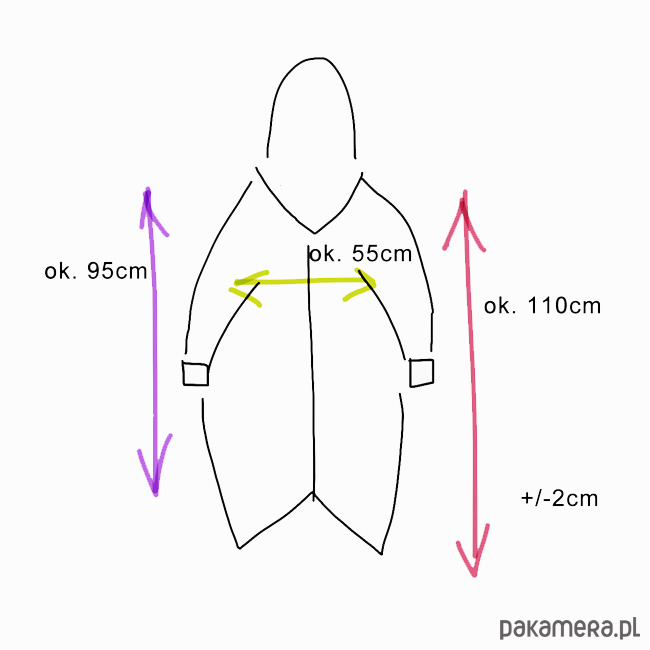 Jeden rozmiar, oversize, szerokość ok. 55cm, długość od ramienia w najkrótszym miejscu ok. 95cm, od ramienia w najdłuższym miejscu ok. 110cm.