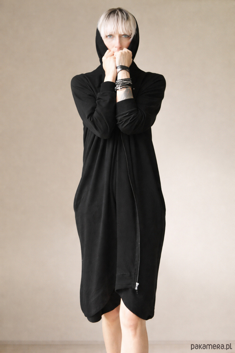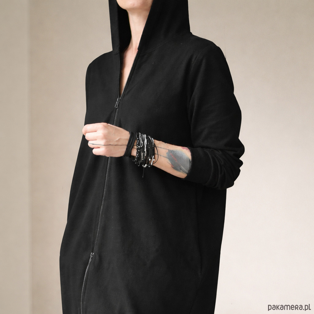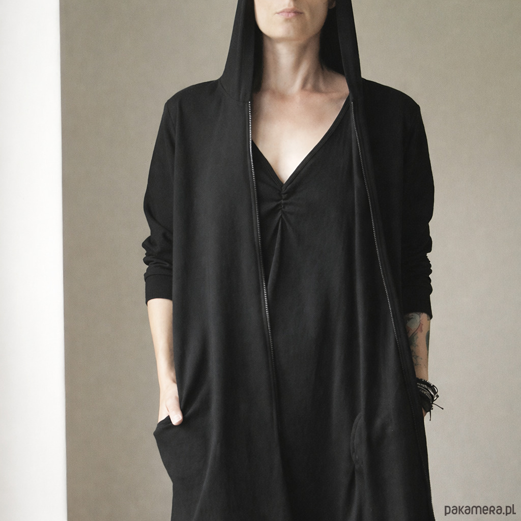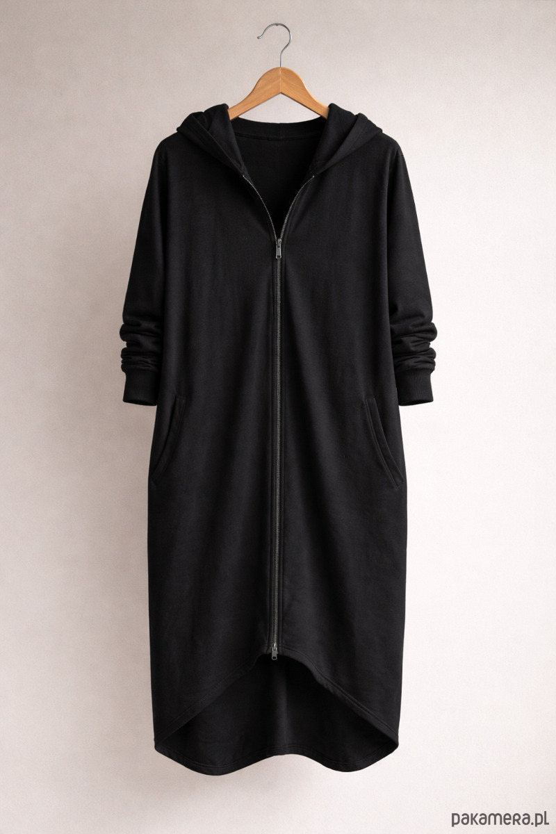 Czarny długi kaptur rozpinany. Oversize’owy, lekko nonszalancki, z kieszeniami na wszystko, co ważne (i mniej ważne też).