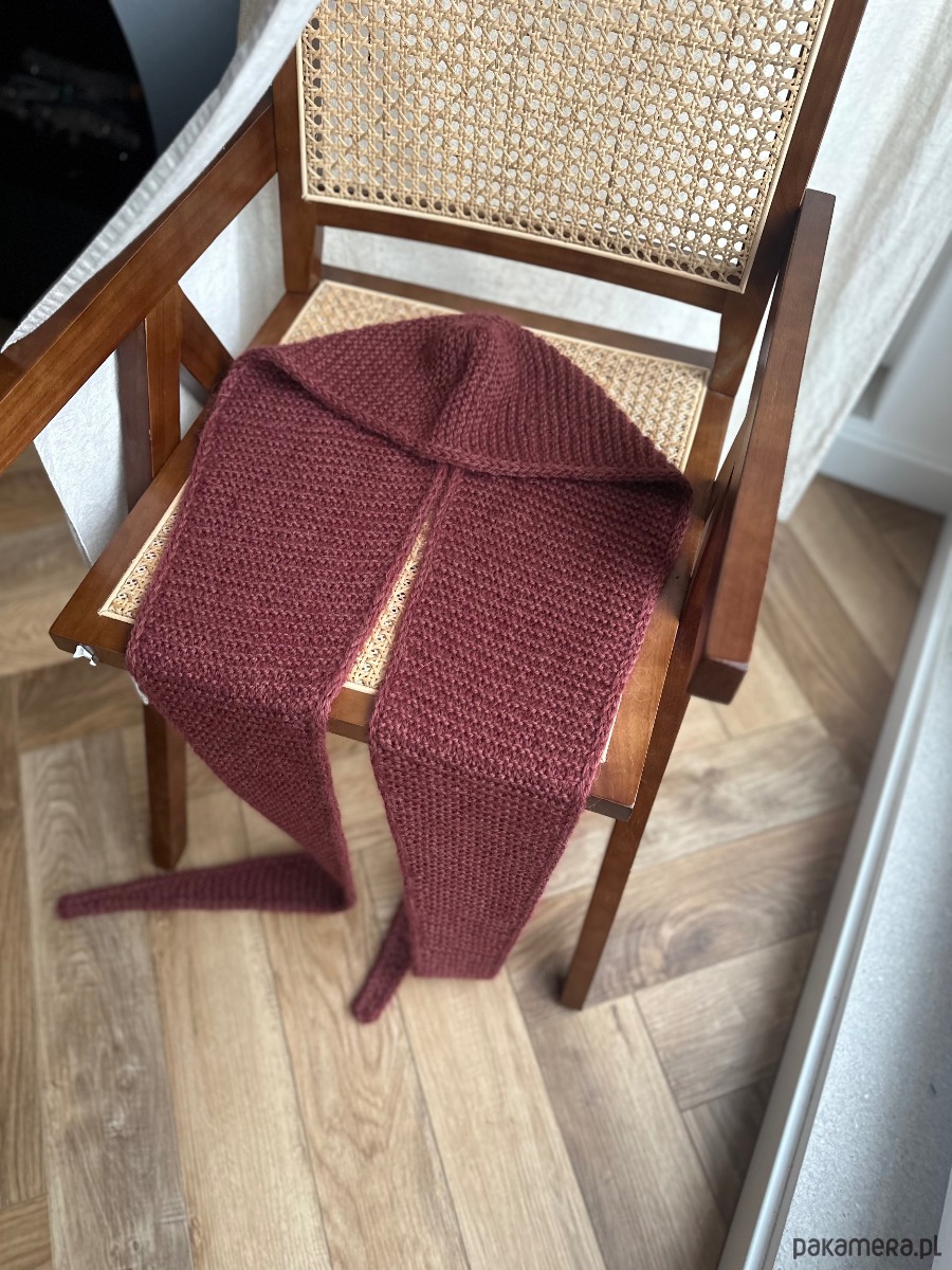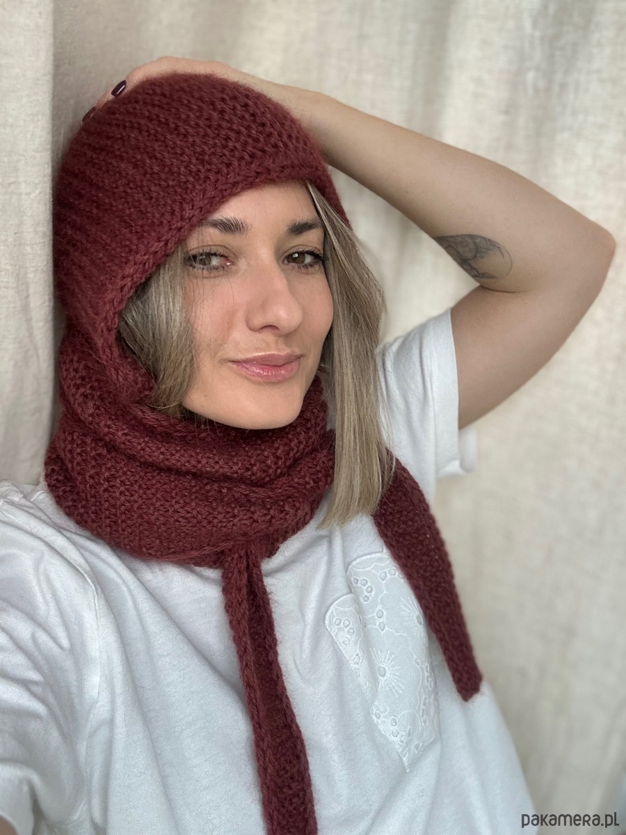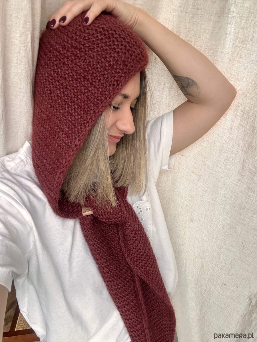 Szalik zwężany z kapturem zaprojektowany i wykonany własnoręcznie przy użyciu wełny naturalnej połączonej z wełną alpaki.