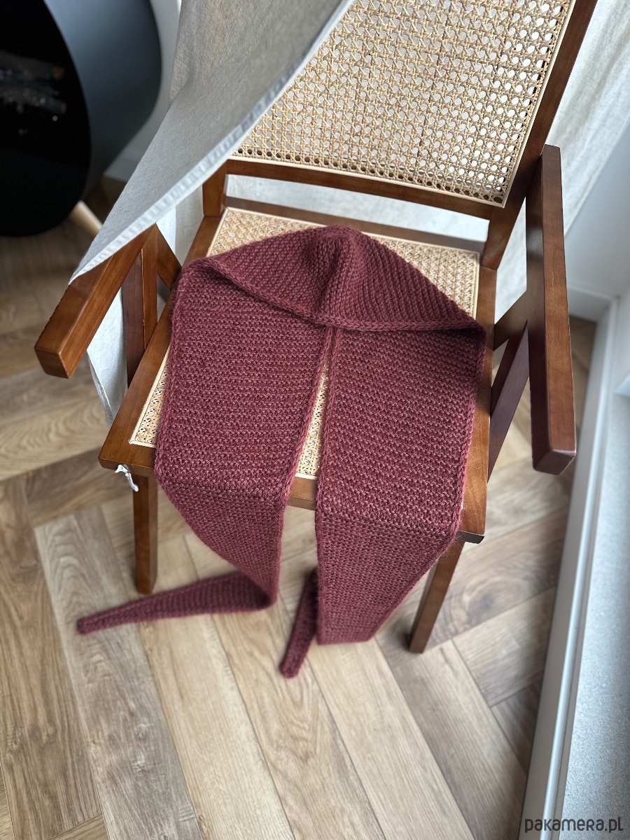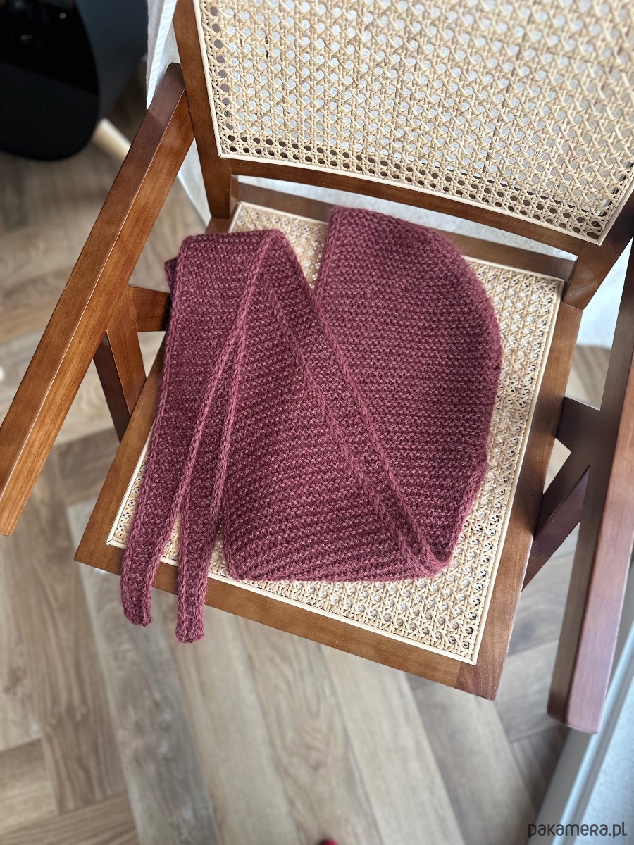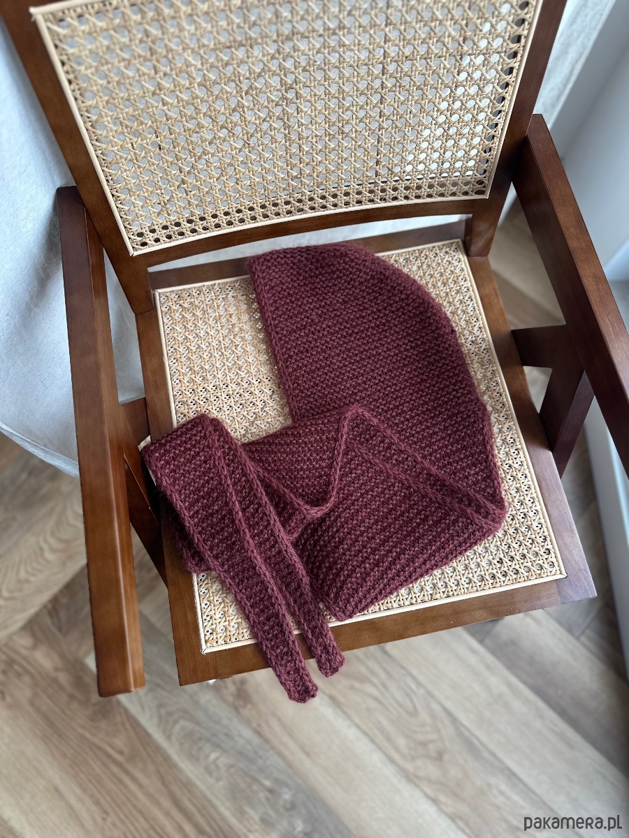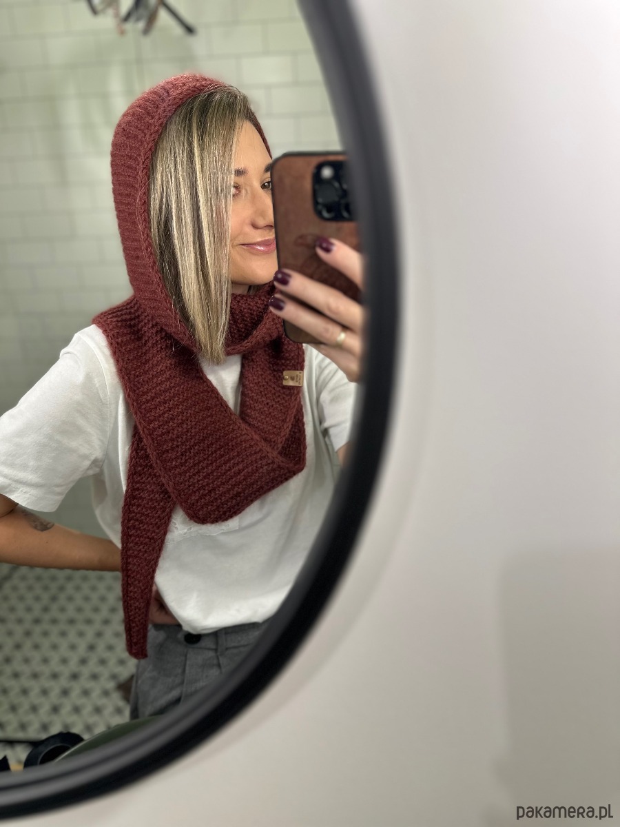 Szalik zwężany z kapturem zaprojektowany i wykonany własnoręcznie przy użyciu wełny naturalnej połączonej z wełną alpaki.