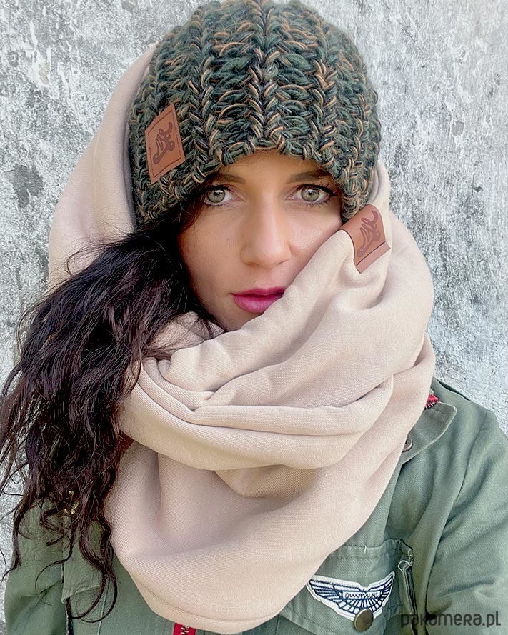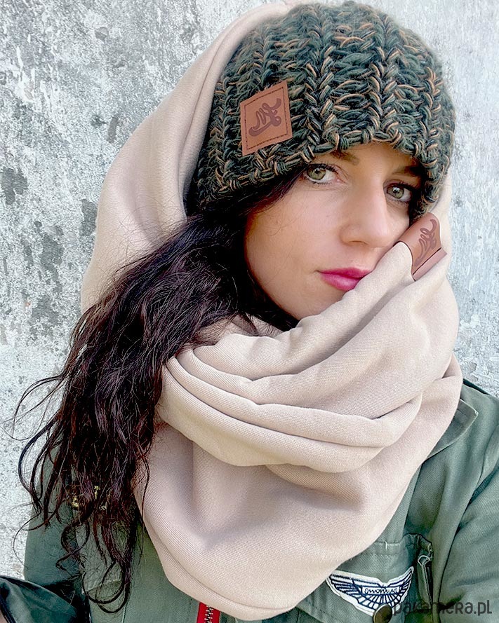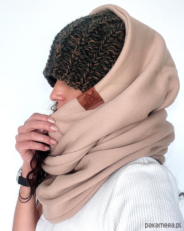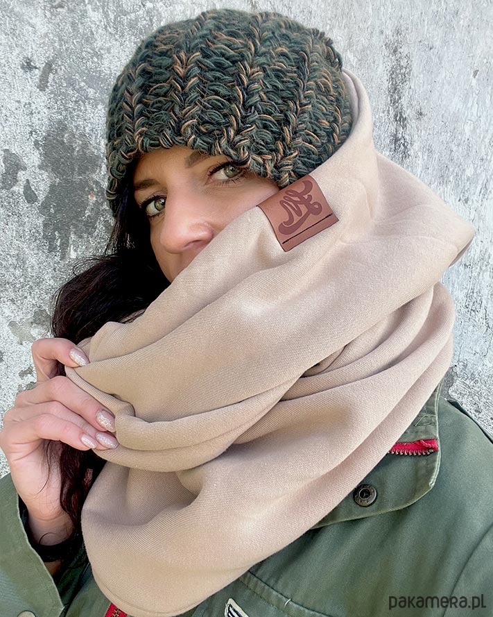 Kaptur z kominem w kolorze beżowym cieplutkie okrycie na głowe i szyje z przyjemnej dresowej dzianiny z metką łapnas, komin przylega szczelnie do szyji dzięki temu jest bardzo ciepły, możesz delikatnie osłonić nim również twarz, niezwykle efektowny i oryginalny pomysł który ożywi każdą stylizację, kaptur po ściągnieciu z głowy służy jako sam komin. Idealny w sezonie jesienno zimowym. Dzianina i sam produkt powstał w 100% w Polsce.