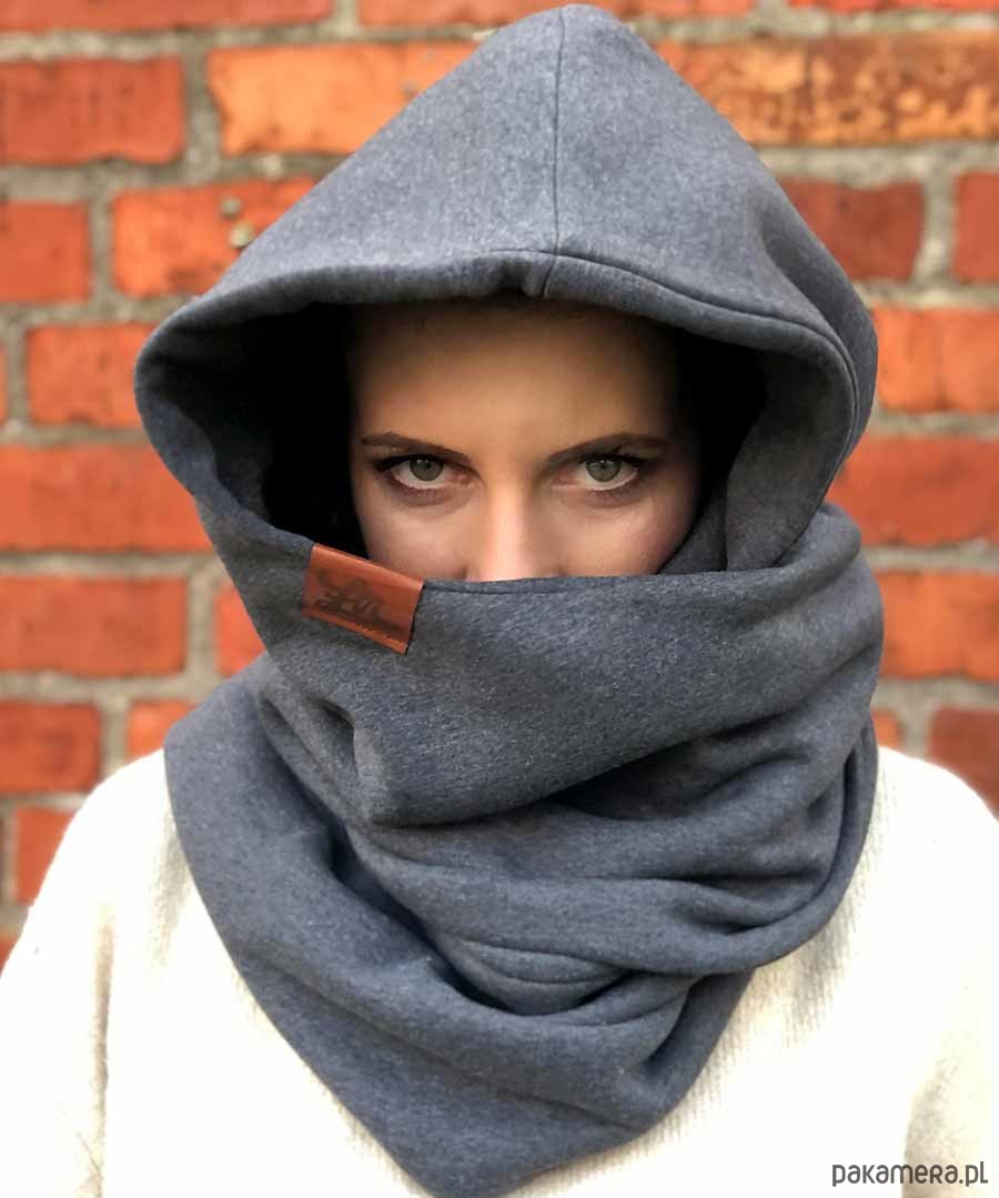 Kaptur z kominem w kolorze grafitowy, cieplutkie okrycie na głowe i szyje z przyjemnej dresowej dzianiny z metką łapnas, komin przylega szczelnie do szyji dzięki temu jest bardzo ciepły, możesz delikatnie osłonić nim również twarz, niezwykle efektowny i oryginalny pomysł który ożywi każdą stylizację, kaptur po ściągnieciu z głowy służy jako sam komin. Idealny w sezonie jesienno zimowym. Dzianina i sam produkt powstał w 100% w Polsce.