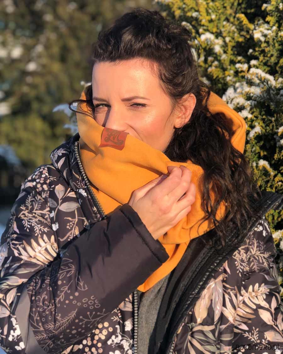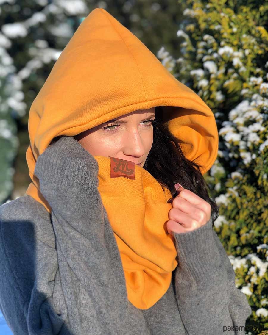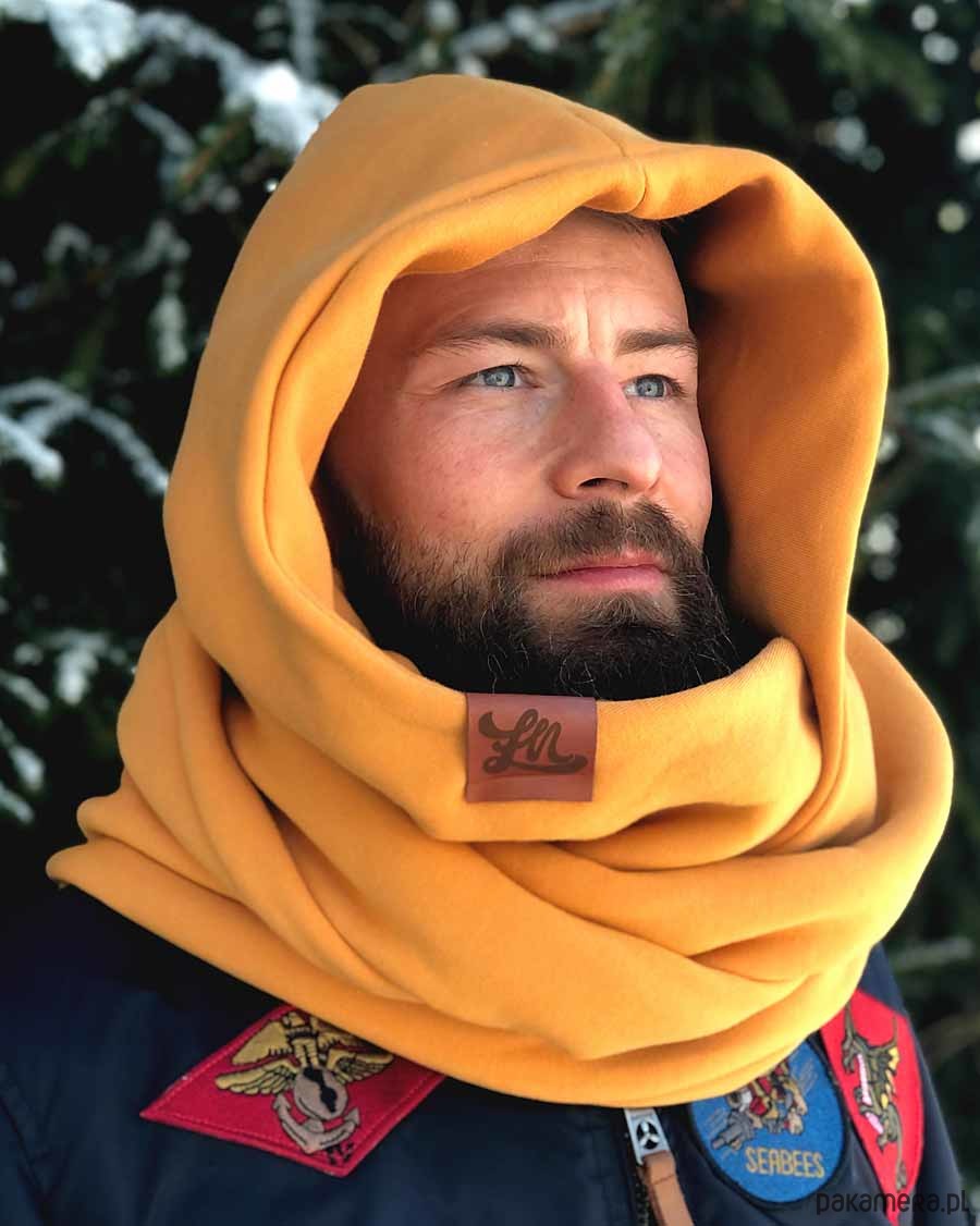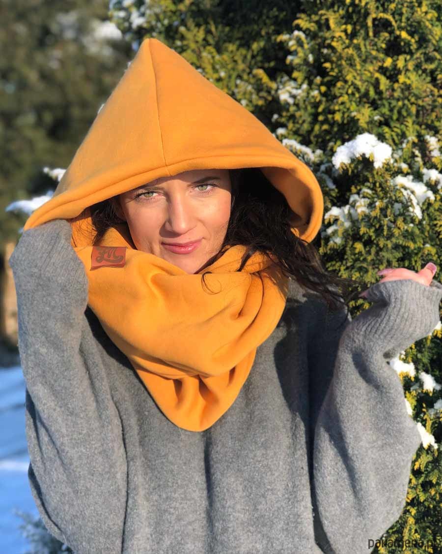 Komin z kapturem w kolorze musztardowo- miodowym cieplutkie okrycie na głowe i szyje z przyjemnej dresowej dzianiny z metką łapnas, komin przylega szczelnie do szyji dzięki temu jest bardzo ciepły, możesz delikatnie osłonić nim również twarz, niezwykle efektowny i oryginalny pomysł który ożywi każdą stylizację, kaptur po ściągnieciu z głowy służy jako sam komin. Idealny w sezonie jesienno zimowym. Dzianina i sam produkt powstał w 100% w Polsce.