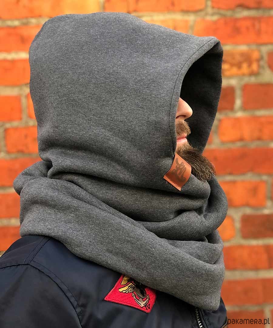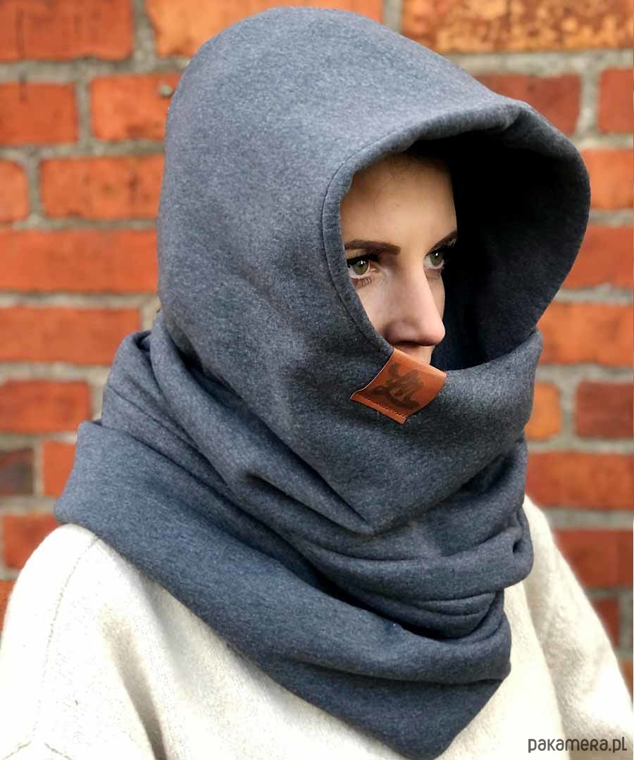 Kaptur z kominem w kolorze grafitowy, cieplutkie okrycie na głowe i szyje z przyjemnej dresowej dzianiny z metką łapnas, komin przylega szczelnie do szyji dzięki temu jest bardzo ciepły, możesz delikatnie osłonić nim również twarz, niezwykle efektowny i oryginalny pomysł który ożywi każdą stylizację, kaptur po ściągnieciu z głowy służy jako sam komin. Idealny w sezonie jesienno zimowym. Dzianina i sam produkt powstał w 100% w Polsce.