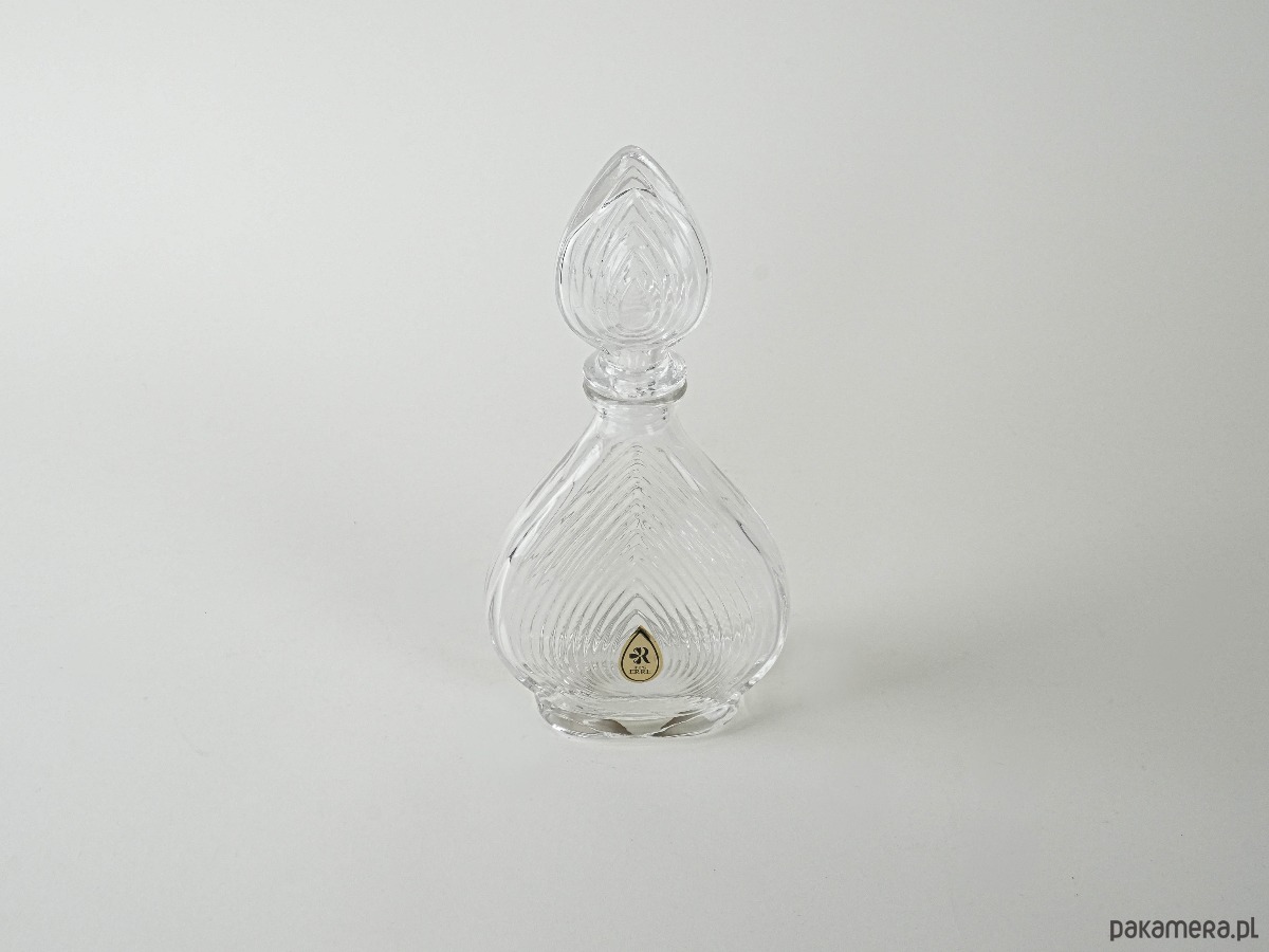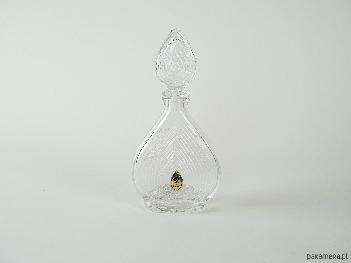 Wysokiej jakości karafka ze szkła kryształowego, sygnowana naklejką producenta Prod. ERRE. Charakteryzuje się dekoracyjnym ryflowaniem w formie symetrycznych, pionowych linii, które nadają jej elegancji i wyjątkowego połysku. Kształt kropli powtórzony został zarówno w formie korpusu, jak i dopasowanego korka, co podkreśla spójność projektu. Idealna do serwowania wina, whisky czy nalewek, a także jako efektowna dekoracja w stylu vintage lub klasycznym.