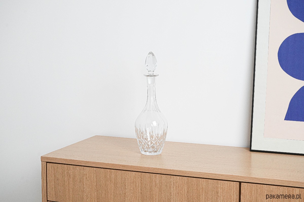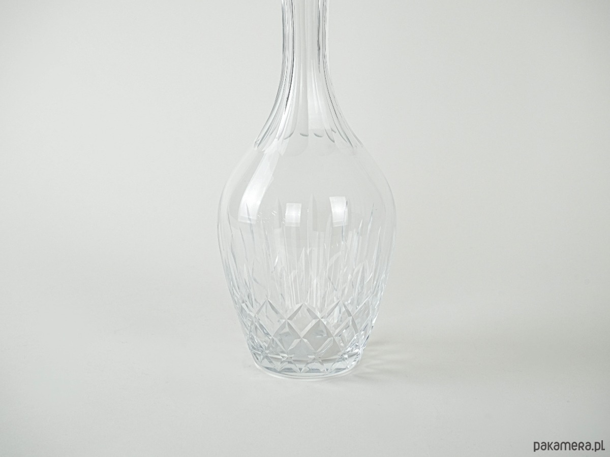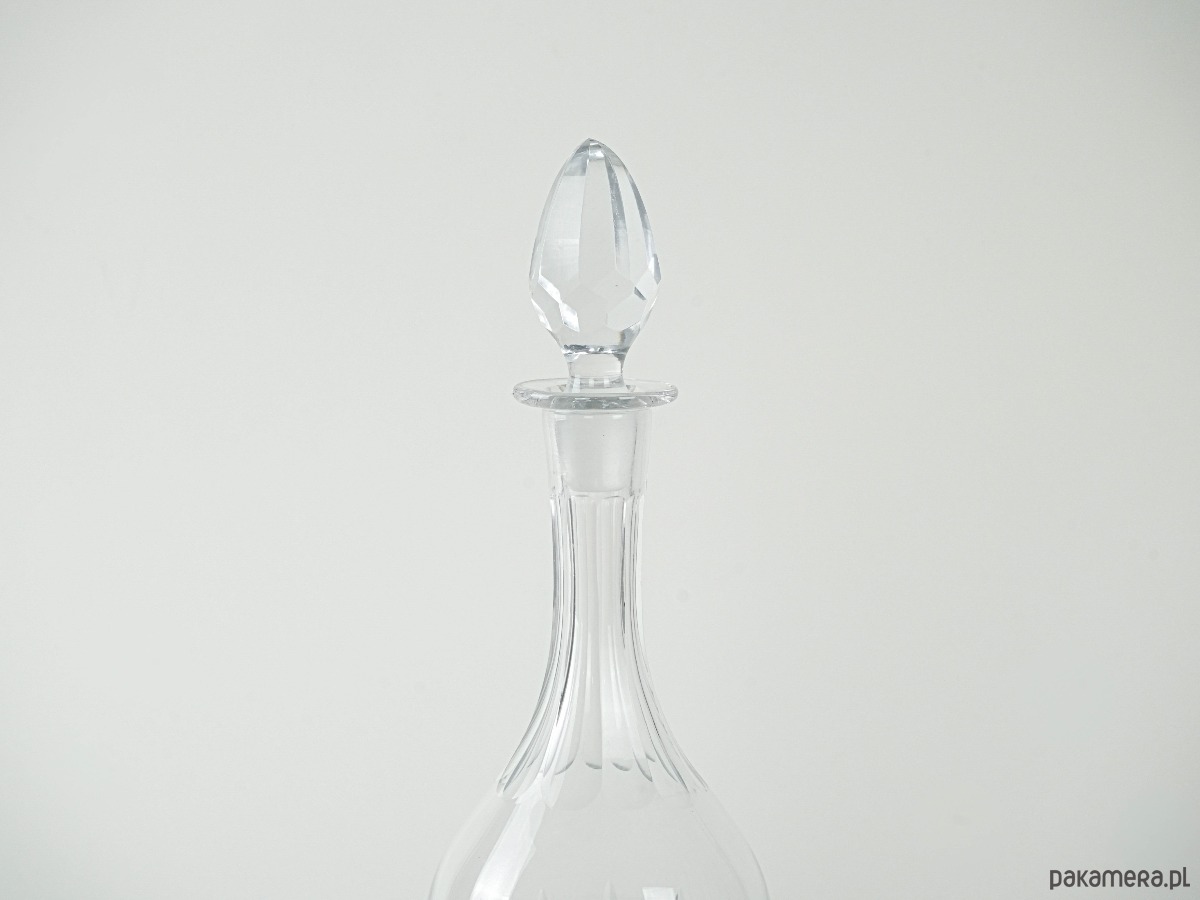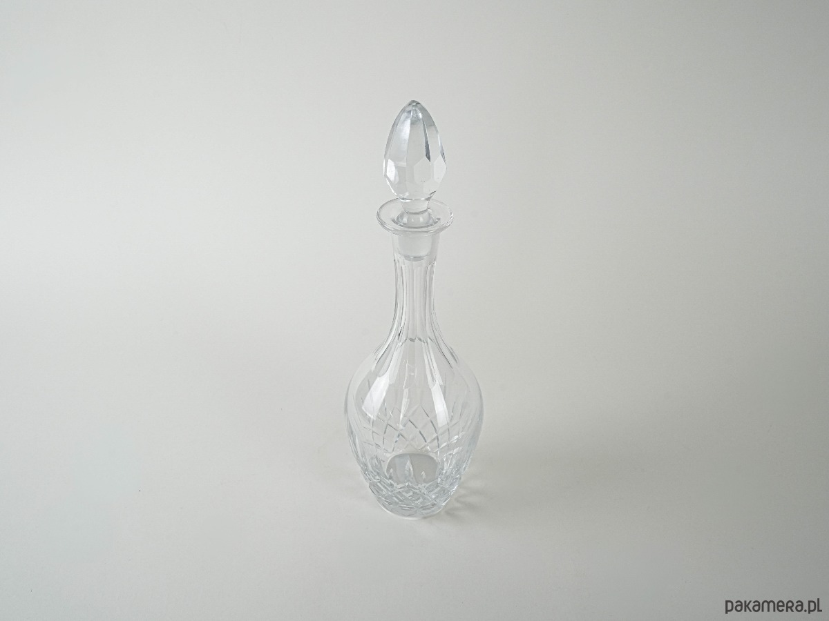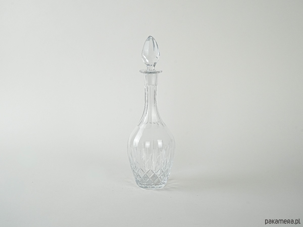 Elegancka karafka wykonana z przejrzystego, wysokiej jakości szkła kryształowego, zdobiona klasycznym, ręcznym szlifem w formie rombów. Smukła szyjka przechodzi w kulisty korpus, a całość wieńczy dopasowany, fasetowany korek o kształcie kropli. Idealna do serwowania whisky, wina lub nalewek, a także jako dekoracyjny element stołu czy kredensu w stylu klasycznym i vintage.