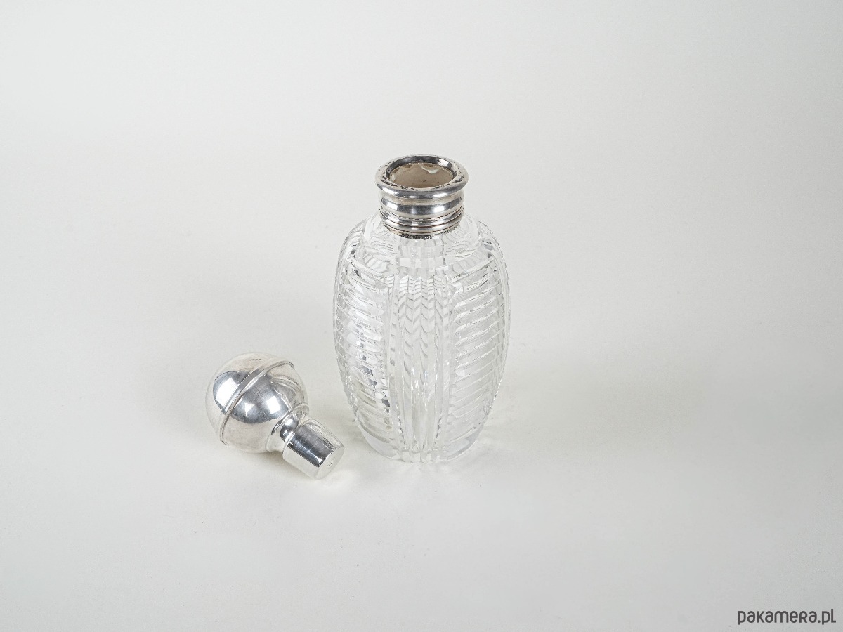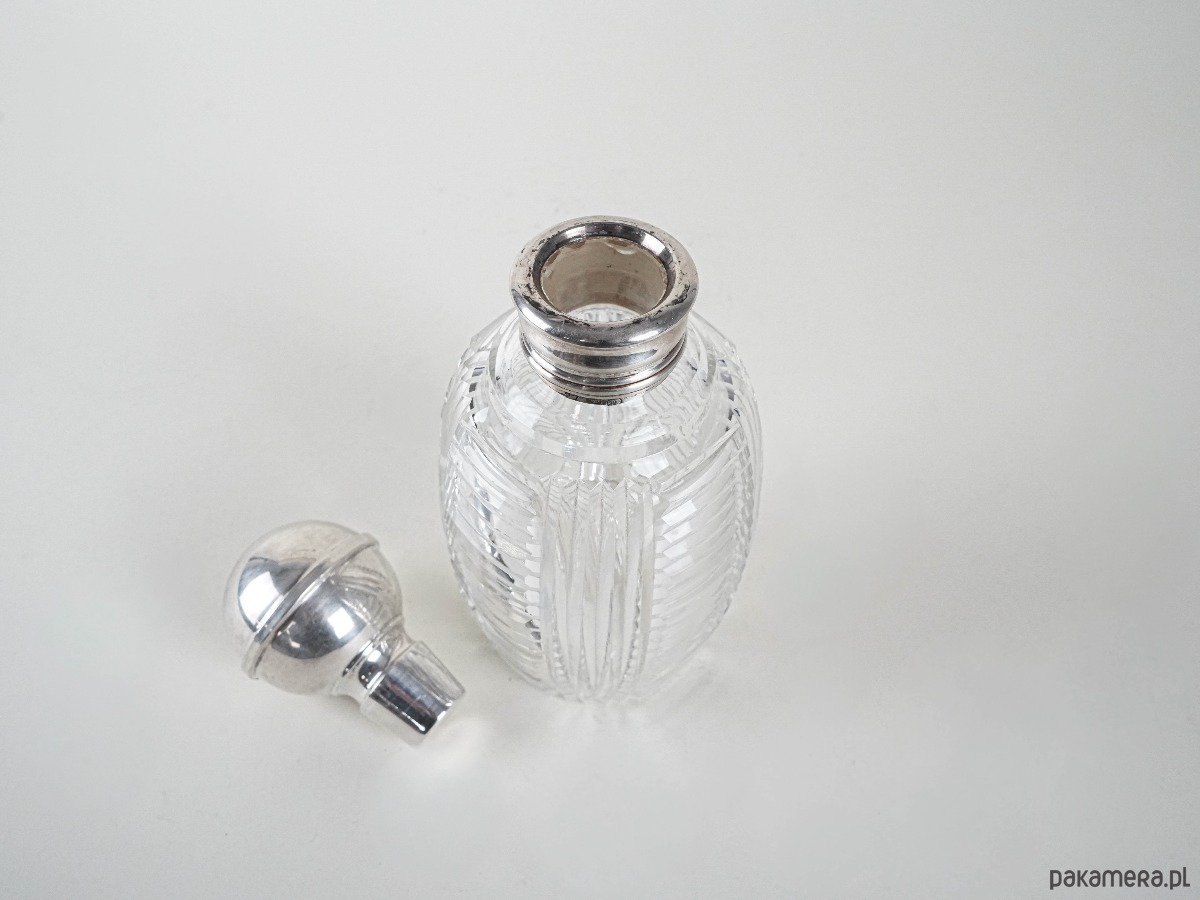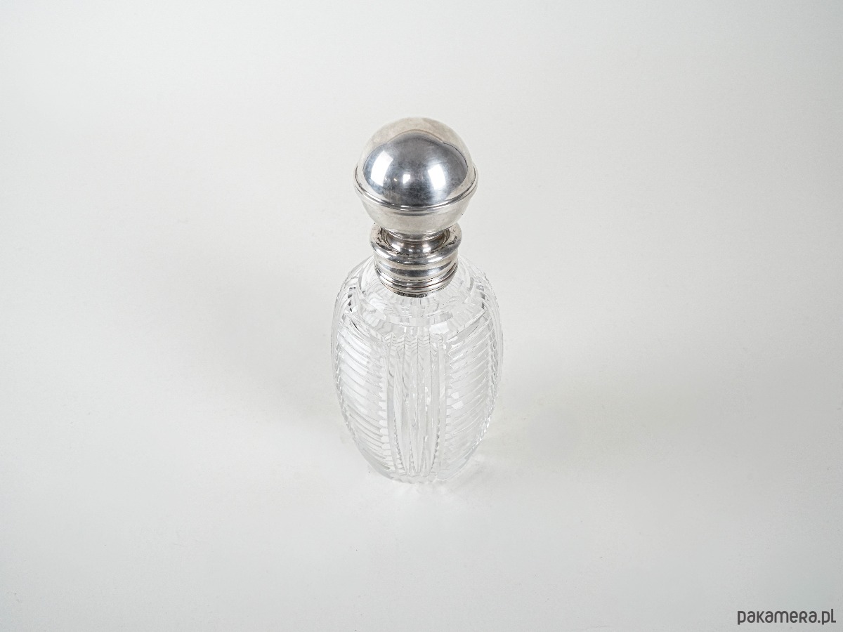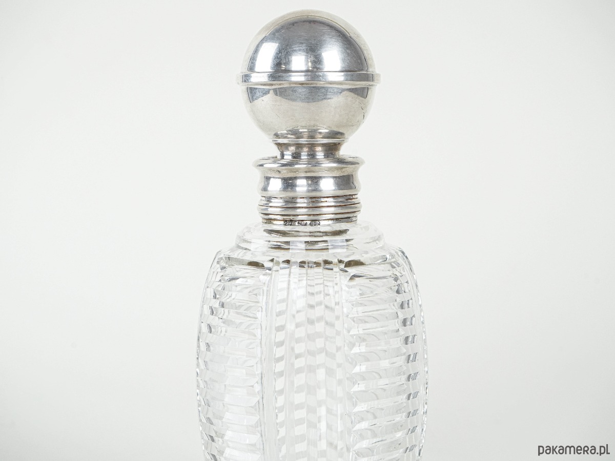 Kryształowa karafka z nakrętką i szyjką wykończoną srebrem próby 925. Wykonana z grubego, ręcznie szlifowanego szkła kryształowego o geometrycznym wzorze, który efektownie odbija światło. Srebrne elementy dodają elegancji i podkreślają luksusowy charakter przedmiotu. Stylowy element vintage, odpowiedni zarówno do użytku, jak i jako ozdoba czy kolekcjonerski eksponat.