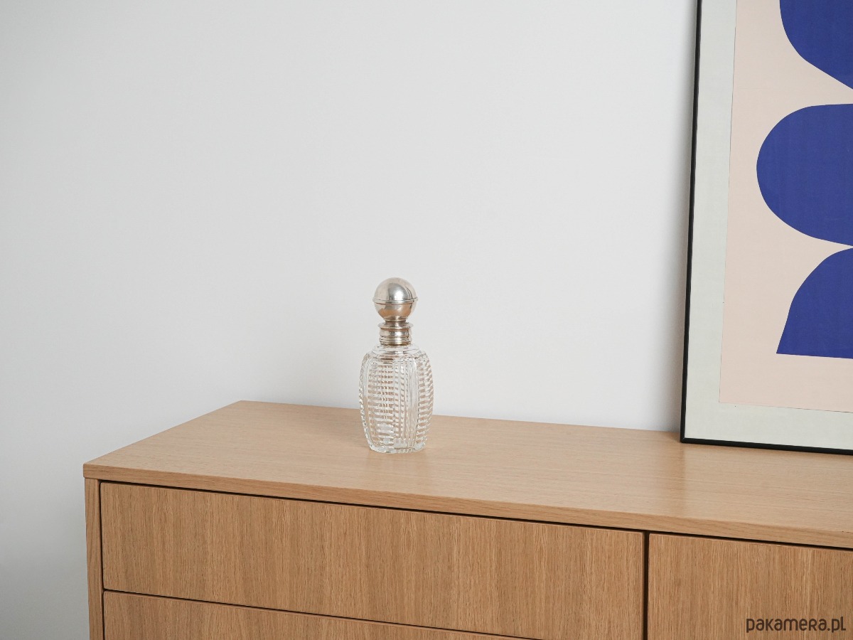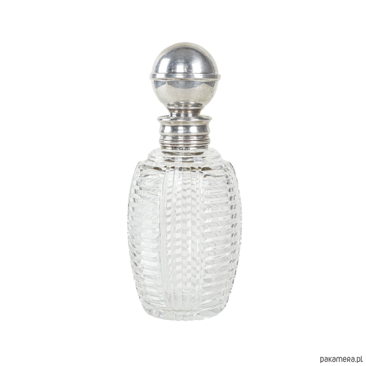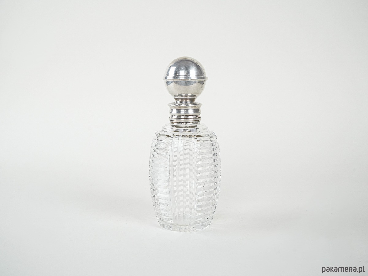 Kryształowa karafka z nakrętką i szyjką wykończoną srebrem próby 925. Wykonana z grubego, ręcznie szlifowanego szkła kryształowego o geometrycznym wzorze, który efektownie odbija światło. Srebrne elementy dodają elegancji i podkreślają luksusowy charakter przedmiotu. Stylowy element vintage, odpowiedni zarówno do użytku, jak i jako ozdoba czy kolekcjonerski eksponat.