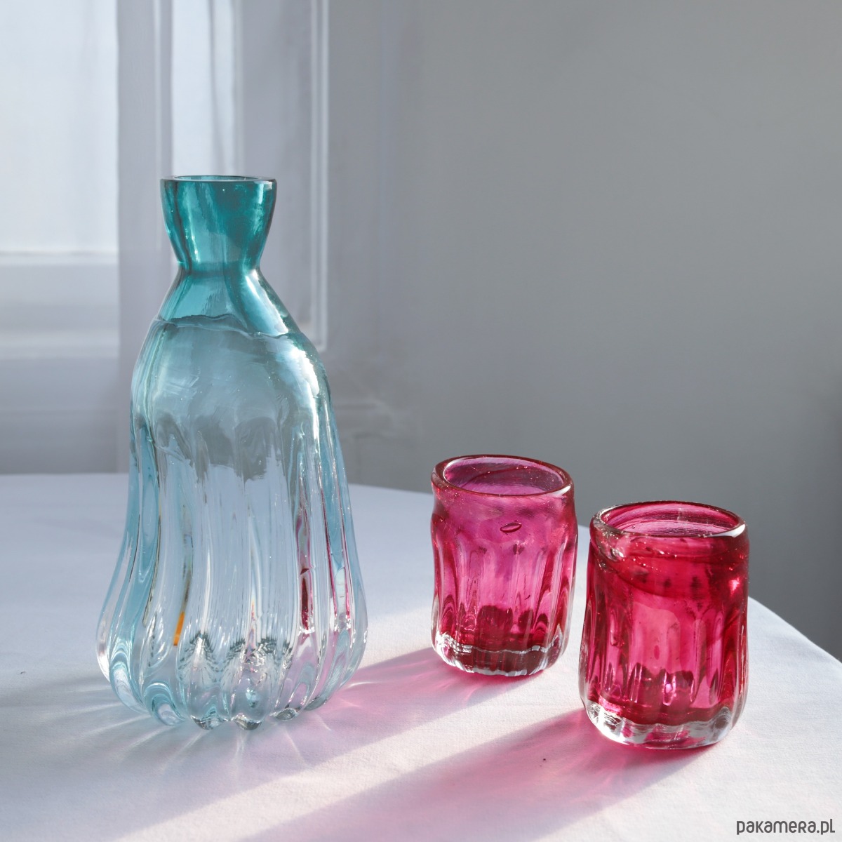 Zestaw dwóch szklanek i karafki powstał z wykorzystaniem metalowej formy dawniej używanej przez hutników do produkcji szkła w technice zwanej optyk. Wykorzystując pierwszy etap tej popularnej techniki uzyskałem fakturę szkła która w kolejnym etapie została podgrzana. W wyniku wysokiej temperatury szkło się zdeformowało i wygładziło. W tym procesie każda kolejna szklanka i karafka jest nieco inna od następnej.