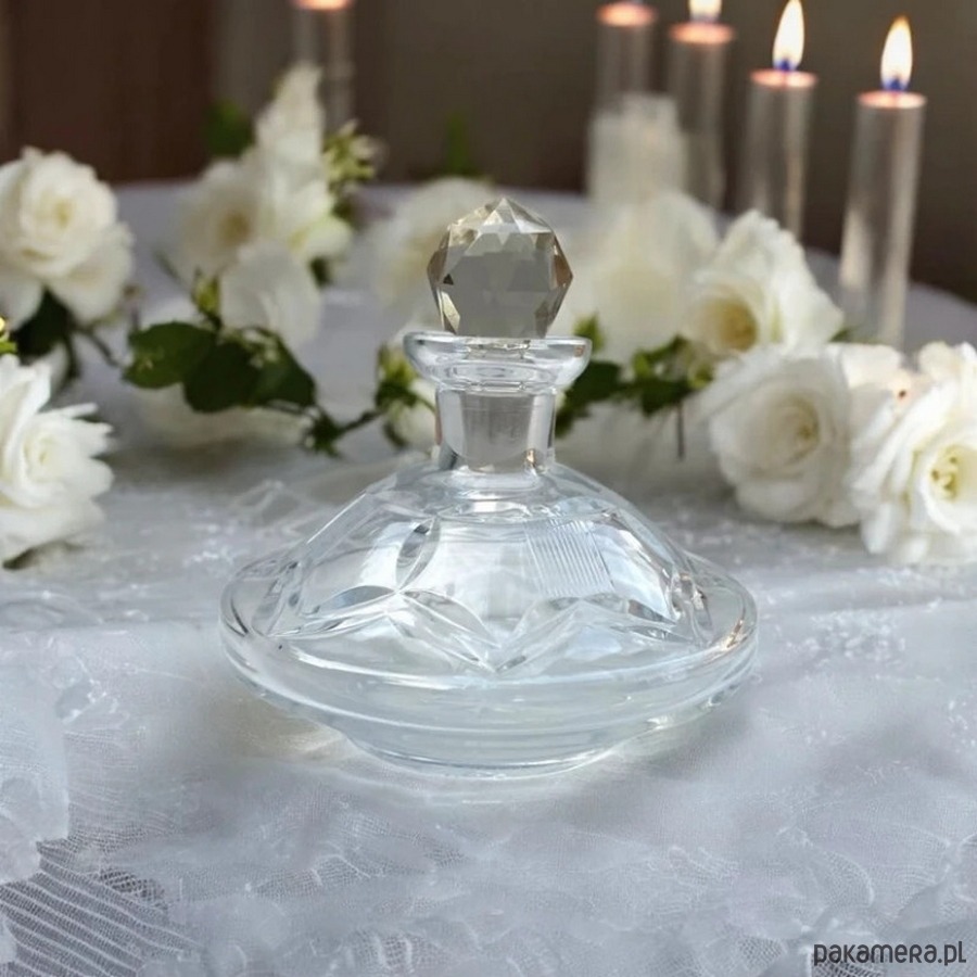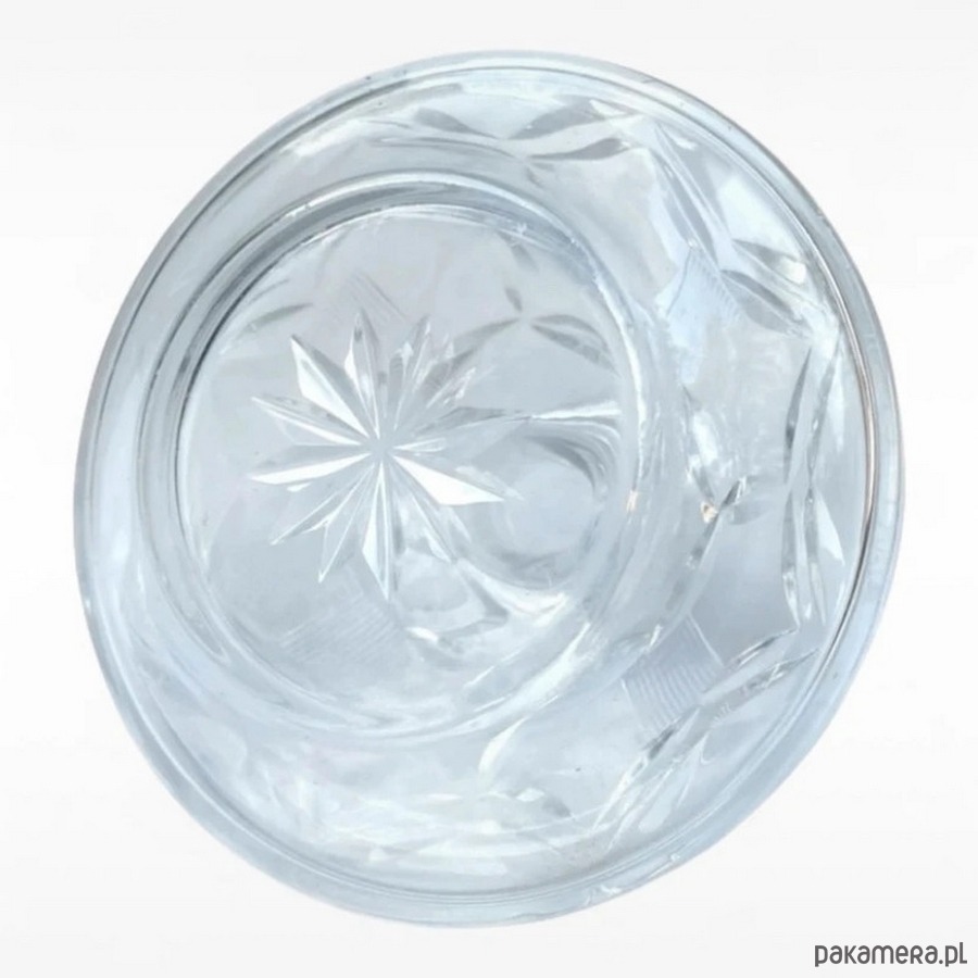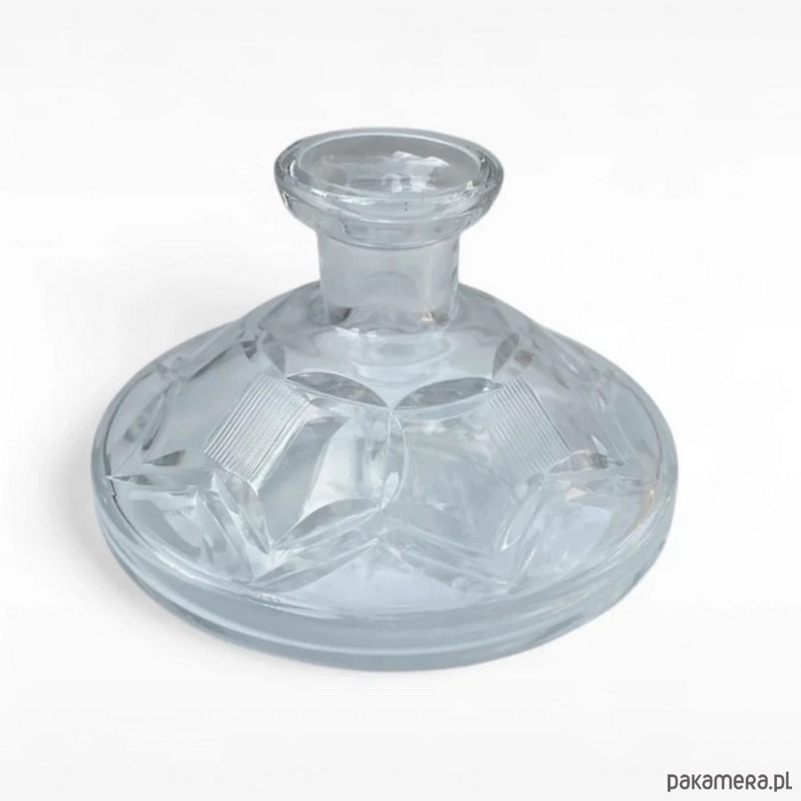 Szklana karafka. Stan bardzo dobry. Wada w postaci skrzywienia korka. Wysokość 11 cm. Szerokość 11 cm .
