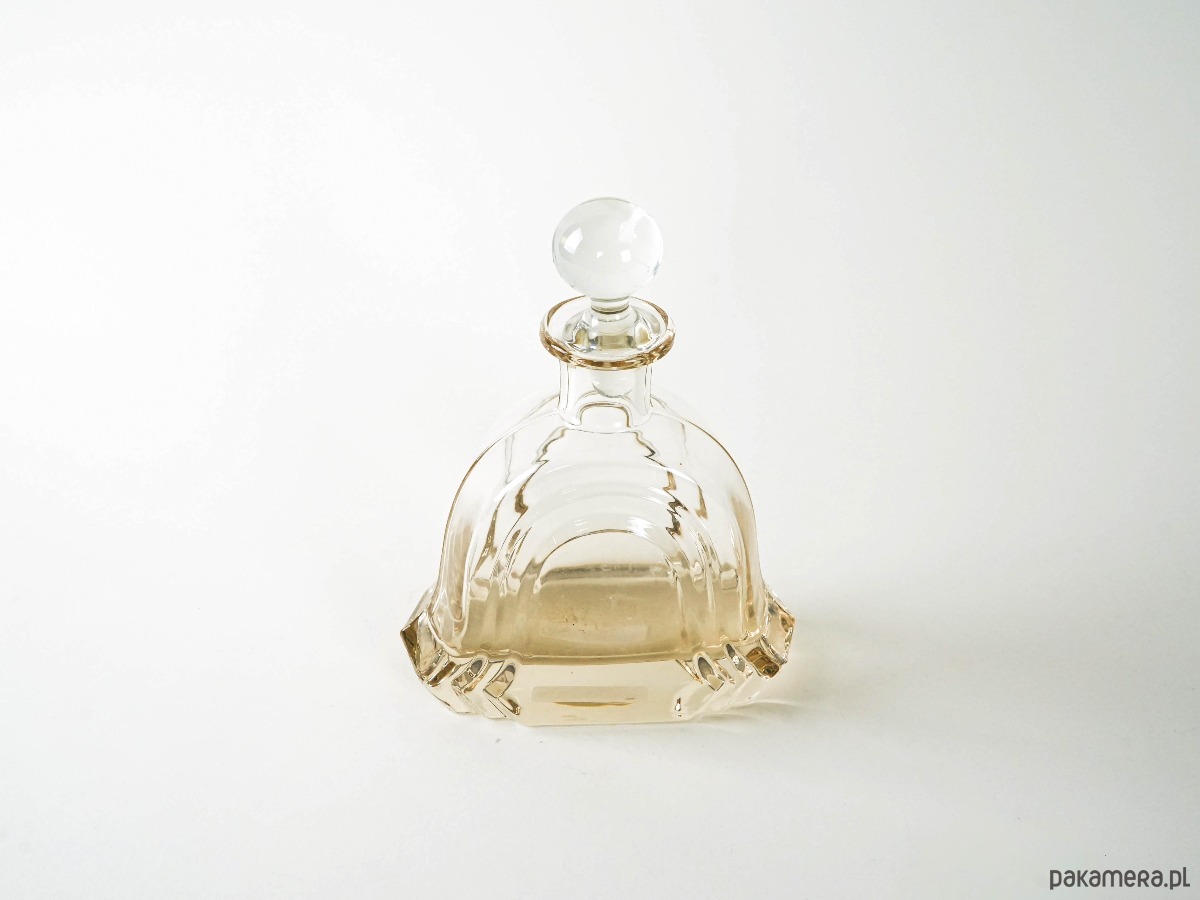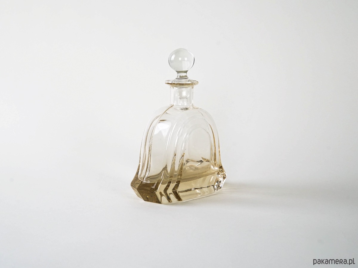 Dekoracyjna karafka o opływowej, rzeźbiarskiej formie, wykonana z grubego, formowanego szkła w ciepłym bursztynowym odcieniu. Zwieńczona kulistym korkiem. Idealna do serwowania whisky lub jako ozdobny akcent na barku czy komodzie.