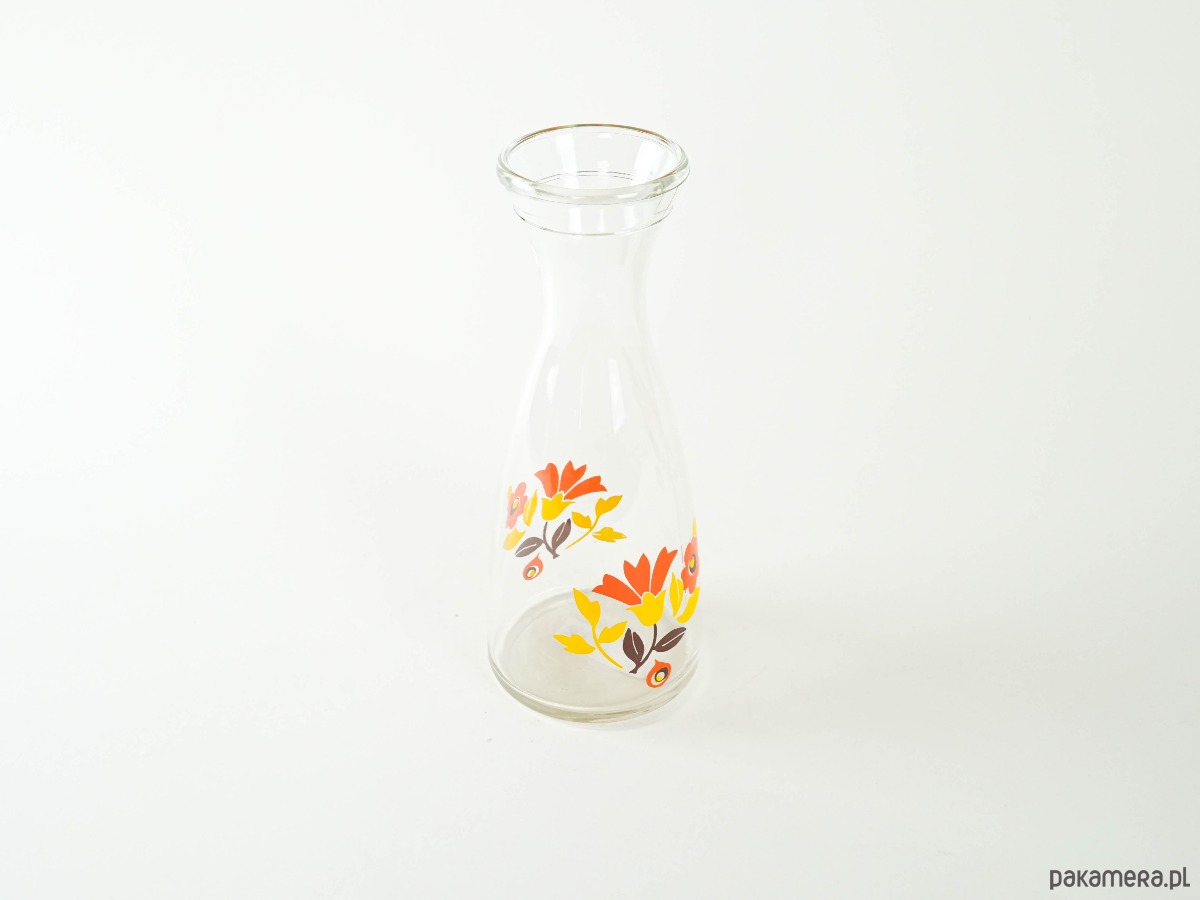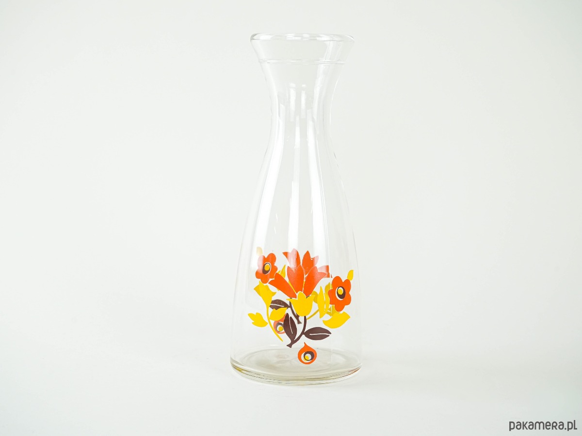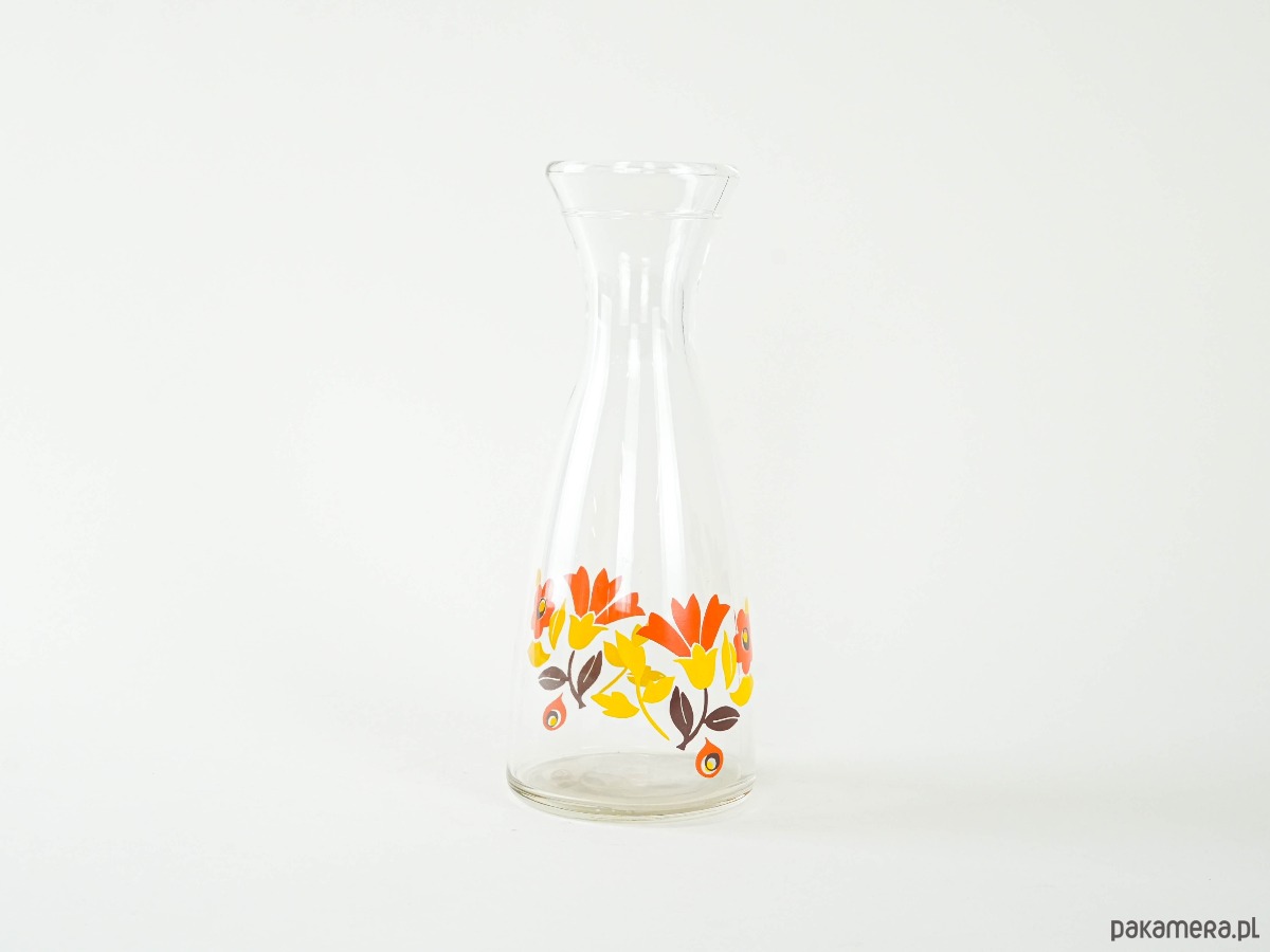 Szklana karafka z szerokim wlewem i barwnym nadrukiem w stylu retro – czerwone, żółte i pomarańczowe kwiaty typowe dla estetyki lat 70. Doskonała do serwowania wody, lemoniady lub jako dekoracyjny akcent kuchenny.