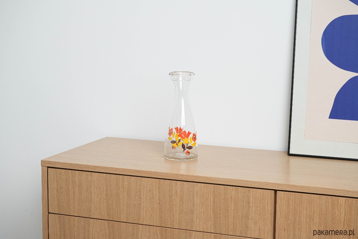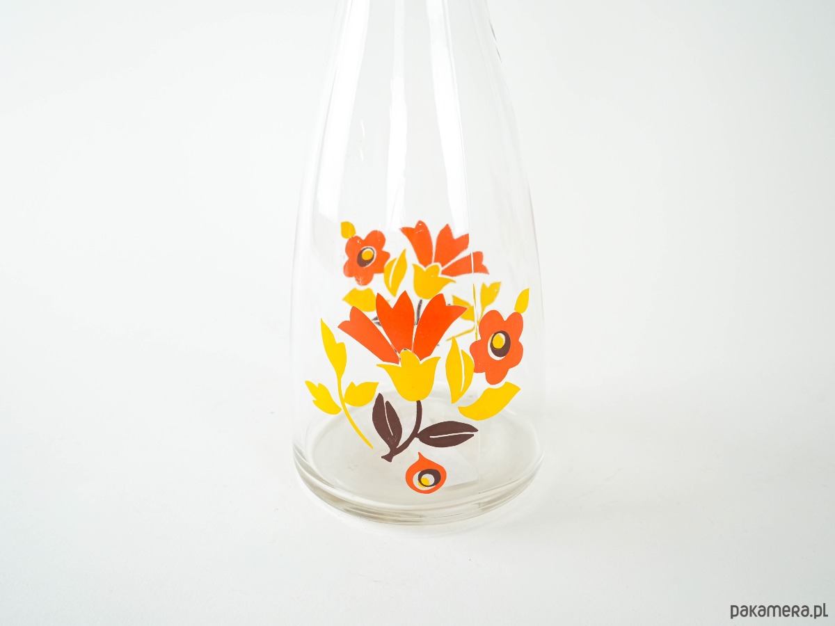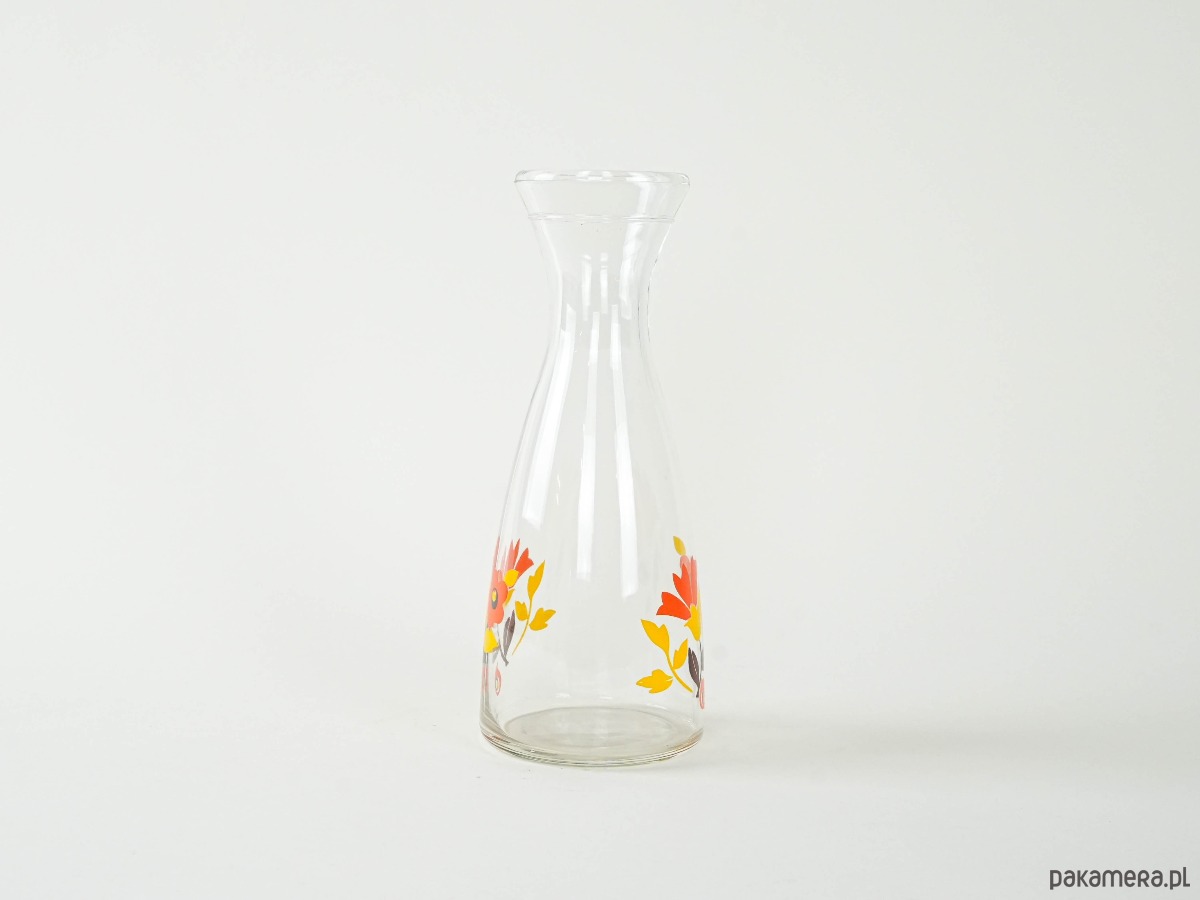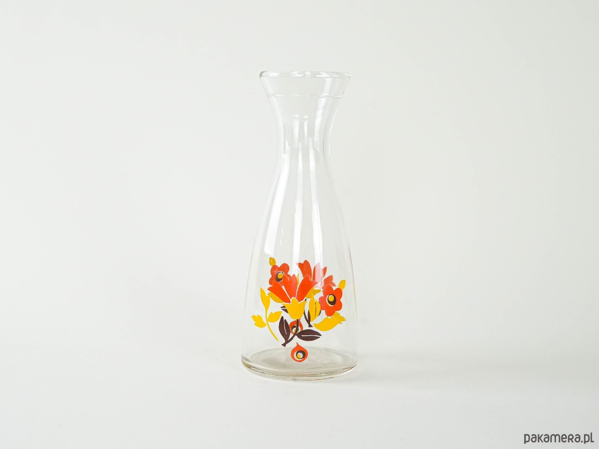 Szklana karafka z szerokim wlewem i barwnym nadrukiem w stylu retro – czerwone, żółte i pomarańczowe kwiaty typowe dla estetyki lat 70. Doskonała do serwowania wody, lemoniady lub jako dekoracyjny akcent kuchenny.